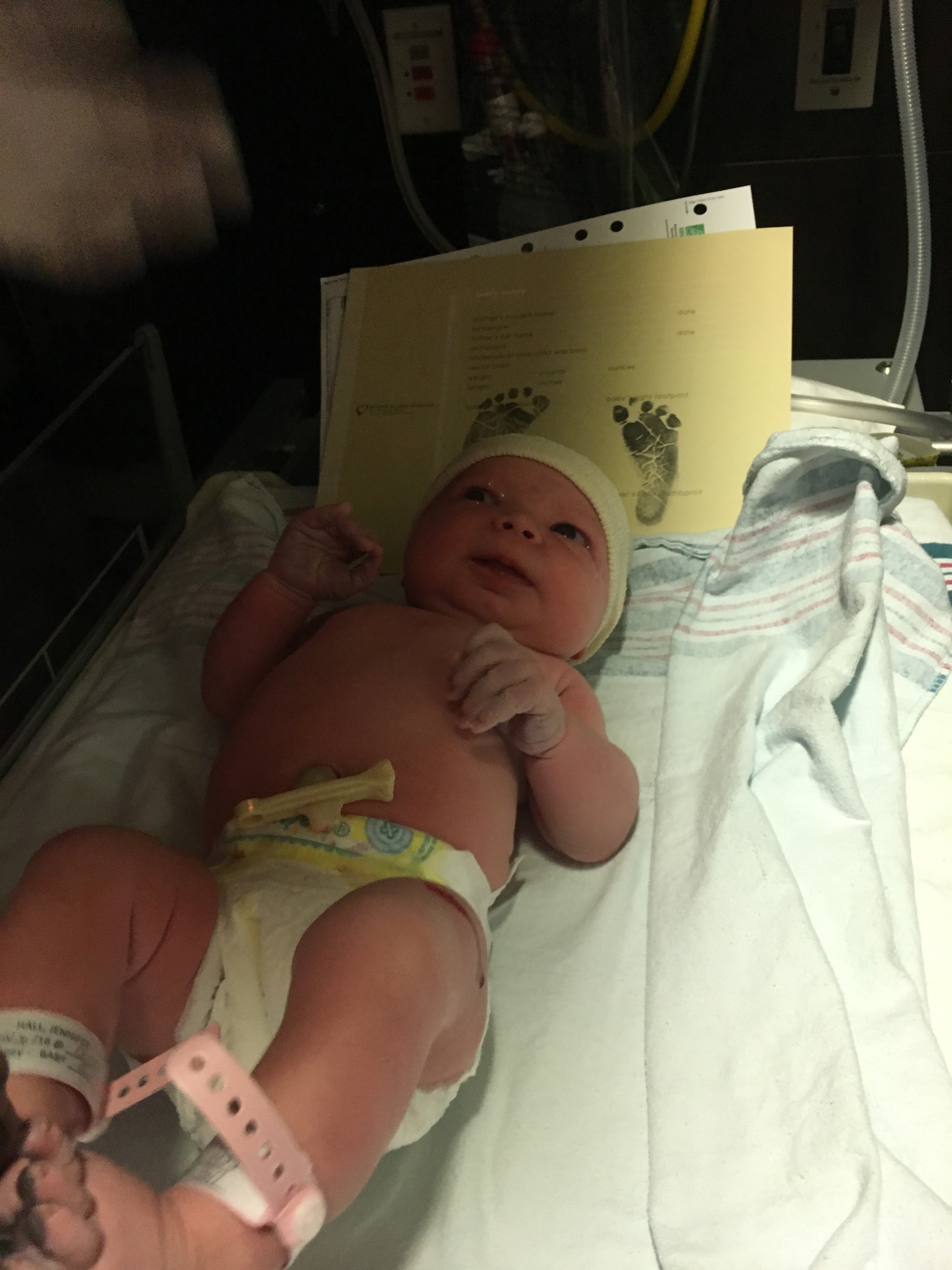 It was a LONG, painful and exhausting 27 hours, but our beautiful little girl made her entrance into the world on Thursday, 10/20/16 at 12:22am! She was obviously waiting for the day she was told in the first place. 😉 She weighed 7lb 15.6oz and was 19.5in long.