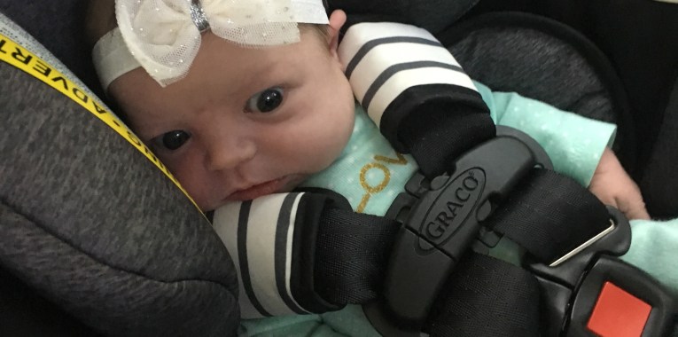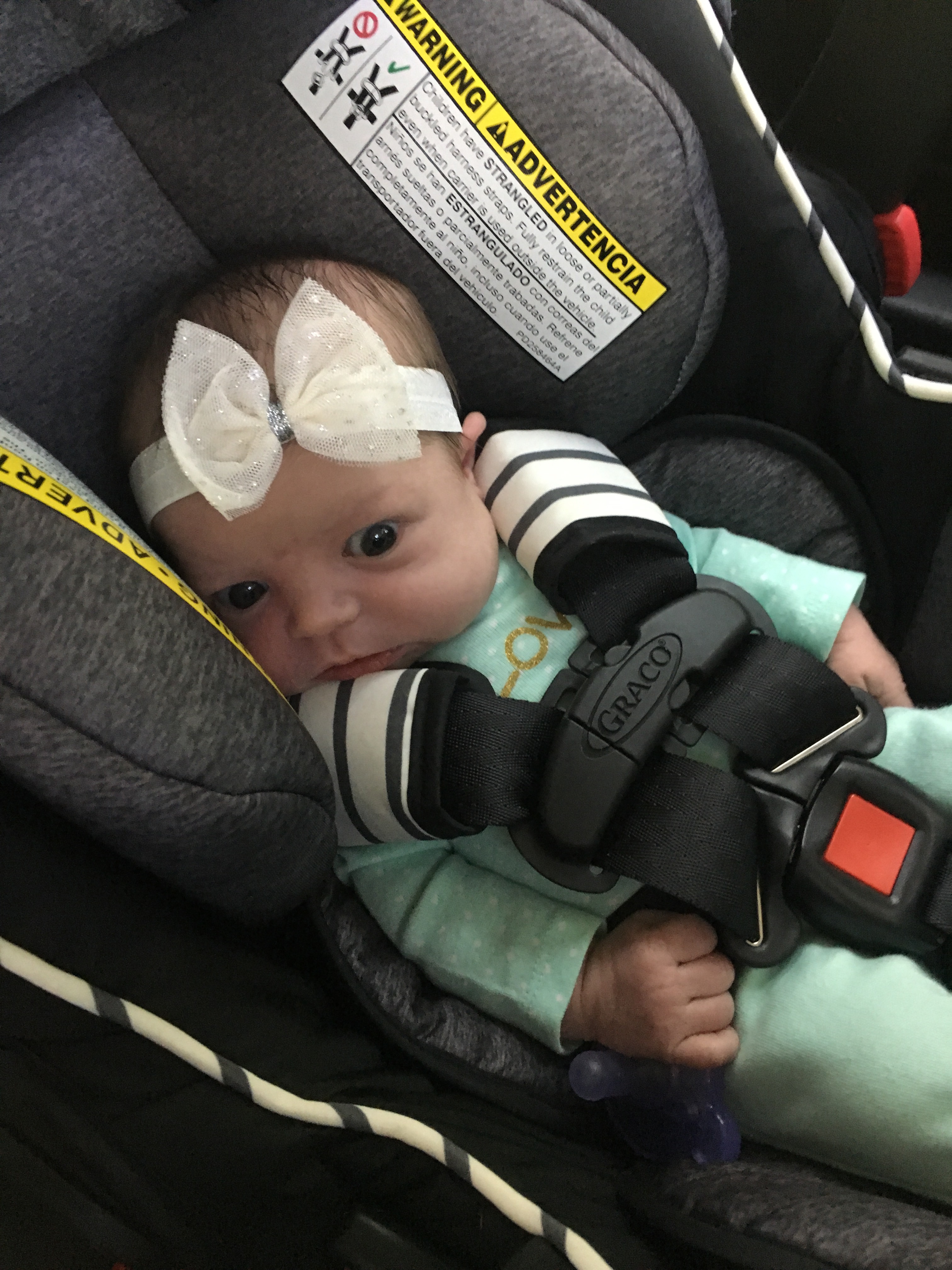 We also found out she loves car rides and her car seat! Especially when daddy swings it back and forth a little. 😉 She rocked her sparkle bow today!