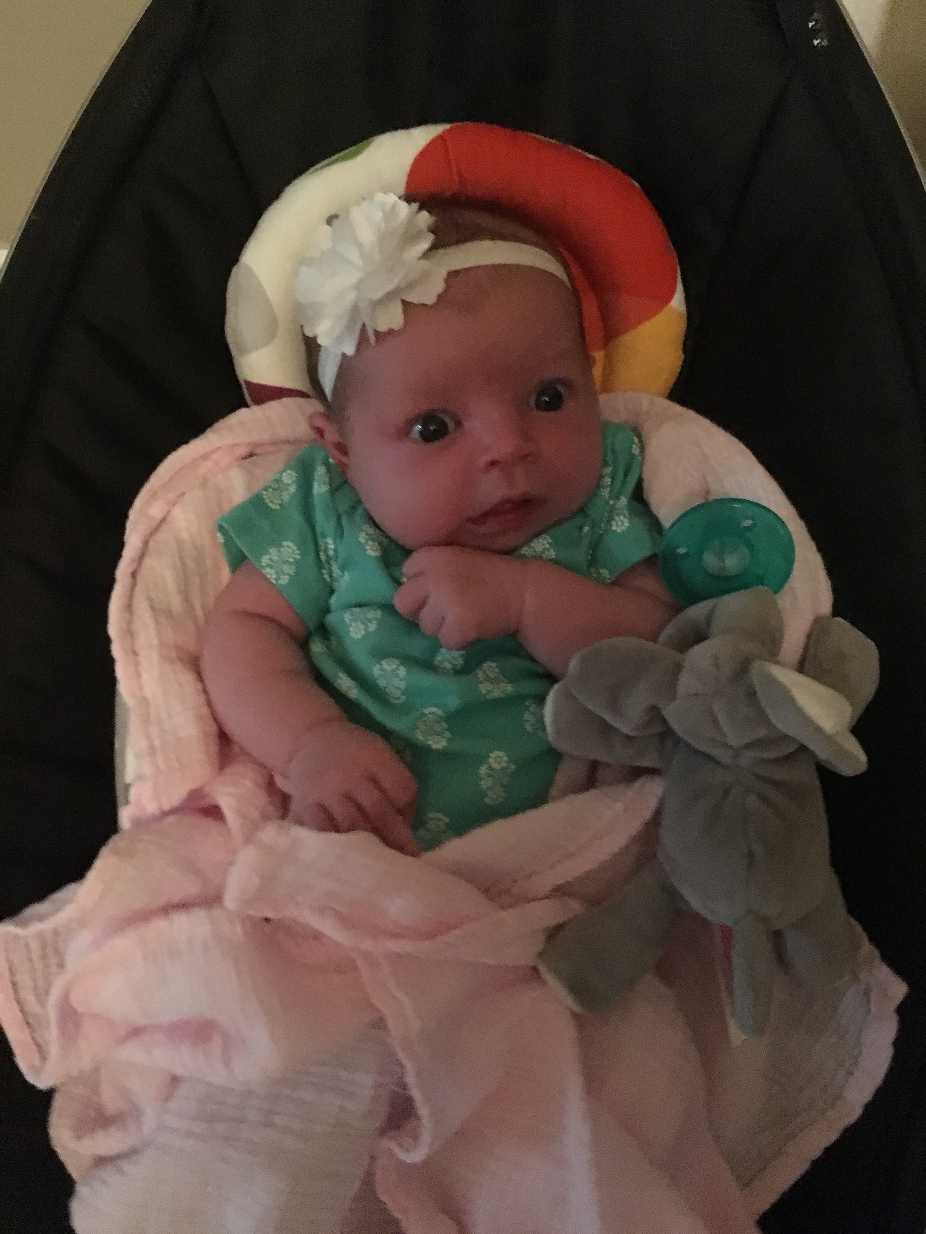 Kensie was chilling in her mamaroo, which she now loves thanks to Chris discovering the “fast” setting, so I got ready and got all of our things together to head out the door. I just had to change K’s diaper and put her clothes on. So, I did. Then I picked her up and she immediately spit up – all over her new, clean, adorable outfit. Super.