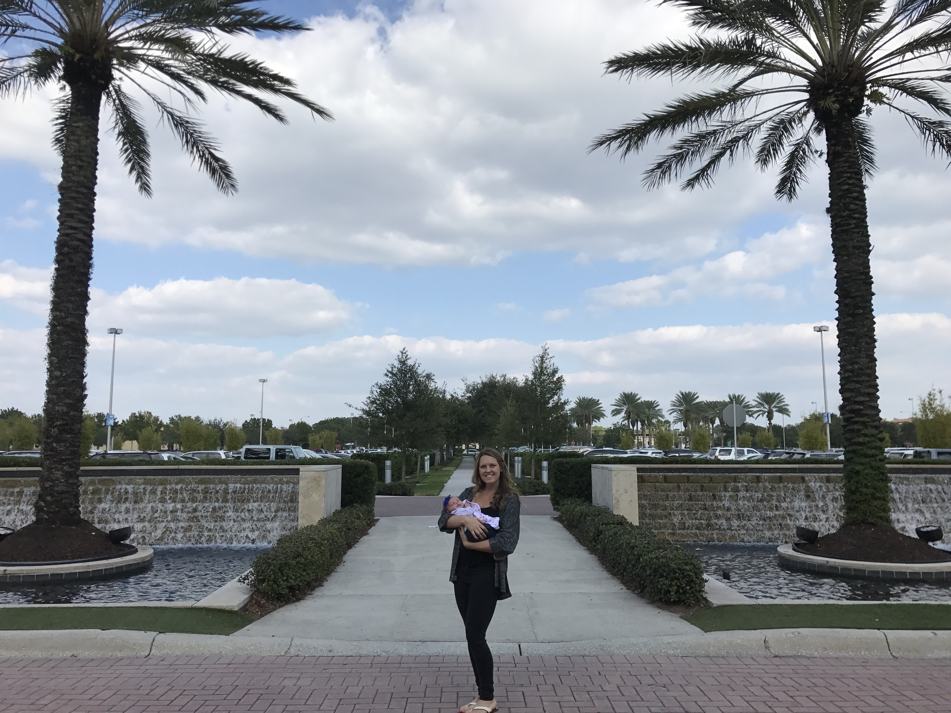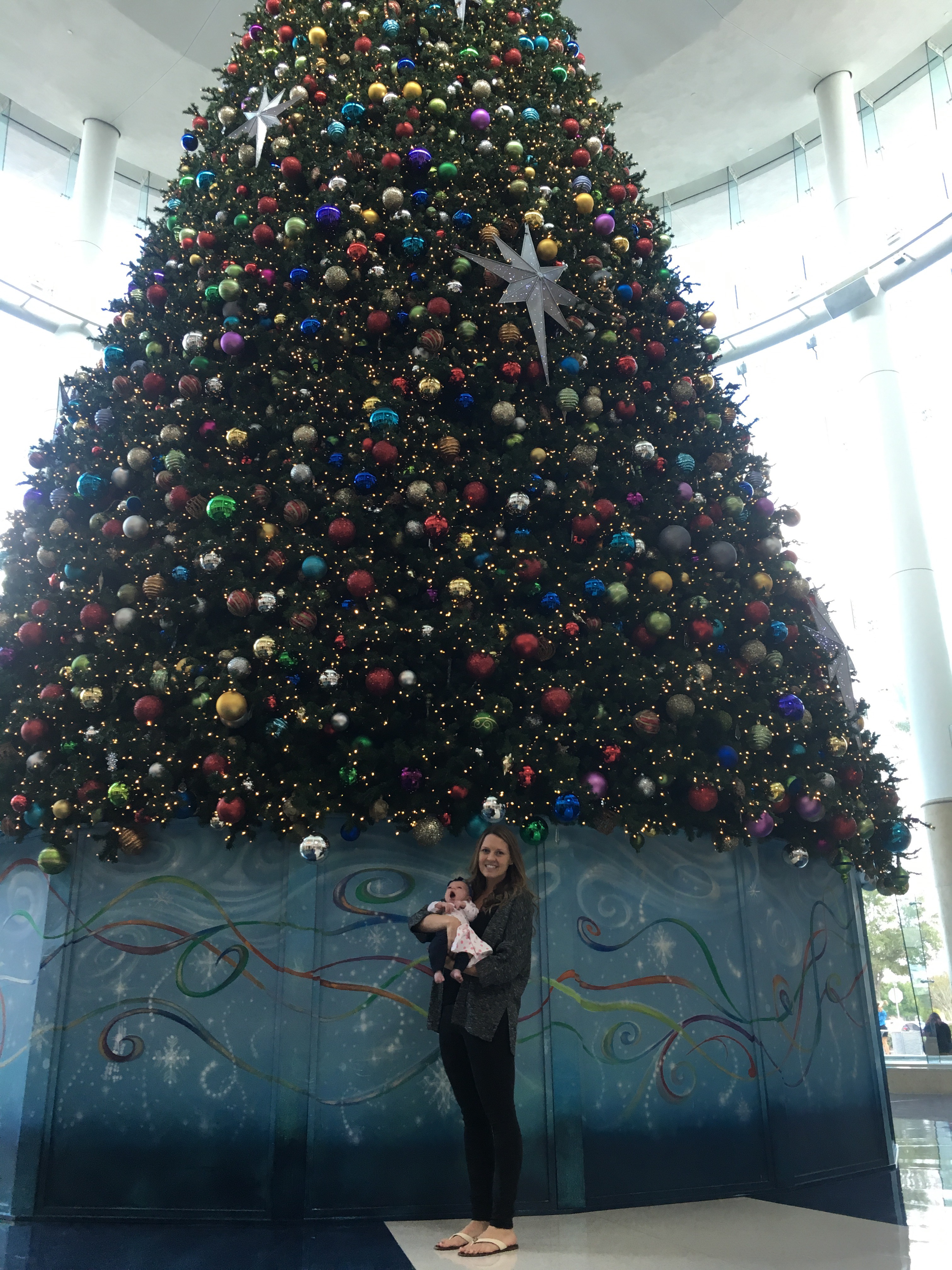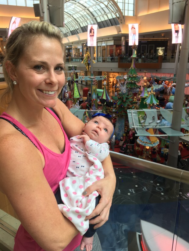 I thought about doing Santa photos – but then I decided it was best not to hand her to some man that’s been touching lots of kids all day to hold my newborn without her shots. Also, we had no interest in waiting in that line. We took one with Santa in the background instead!