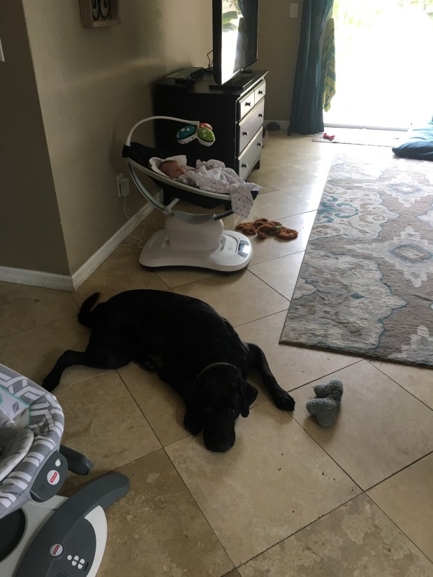 This is from another day…Jack always lays by her when she’s in her Mamaroo! Every time she cries, he runs to her. He sure does love his Kensie!