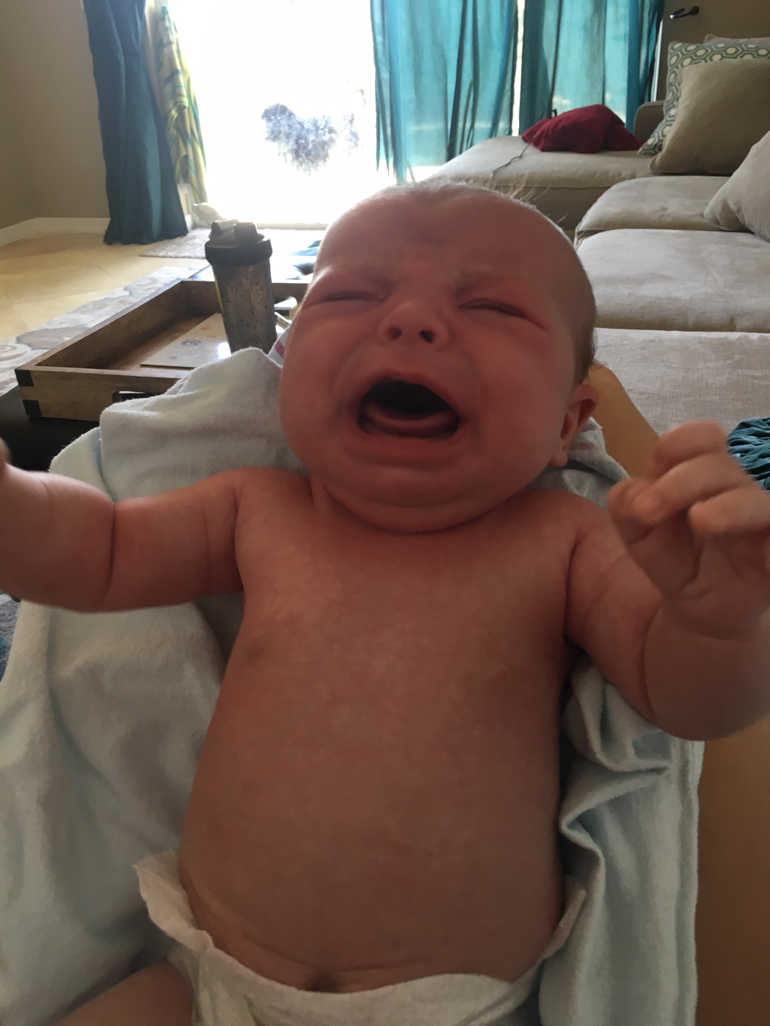 Last week when Kensie had her fussy fits it was in the evening. She wakes up with gas a lot and gets fussy, but this morning was a whole new level. If I wasn’t holding her, she was full out screaming. Once I picked her up it still took a while to settle her down.