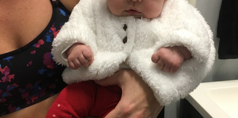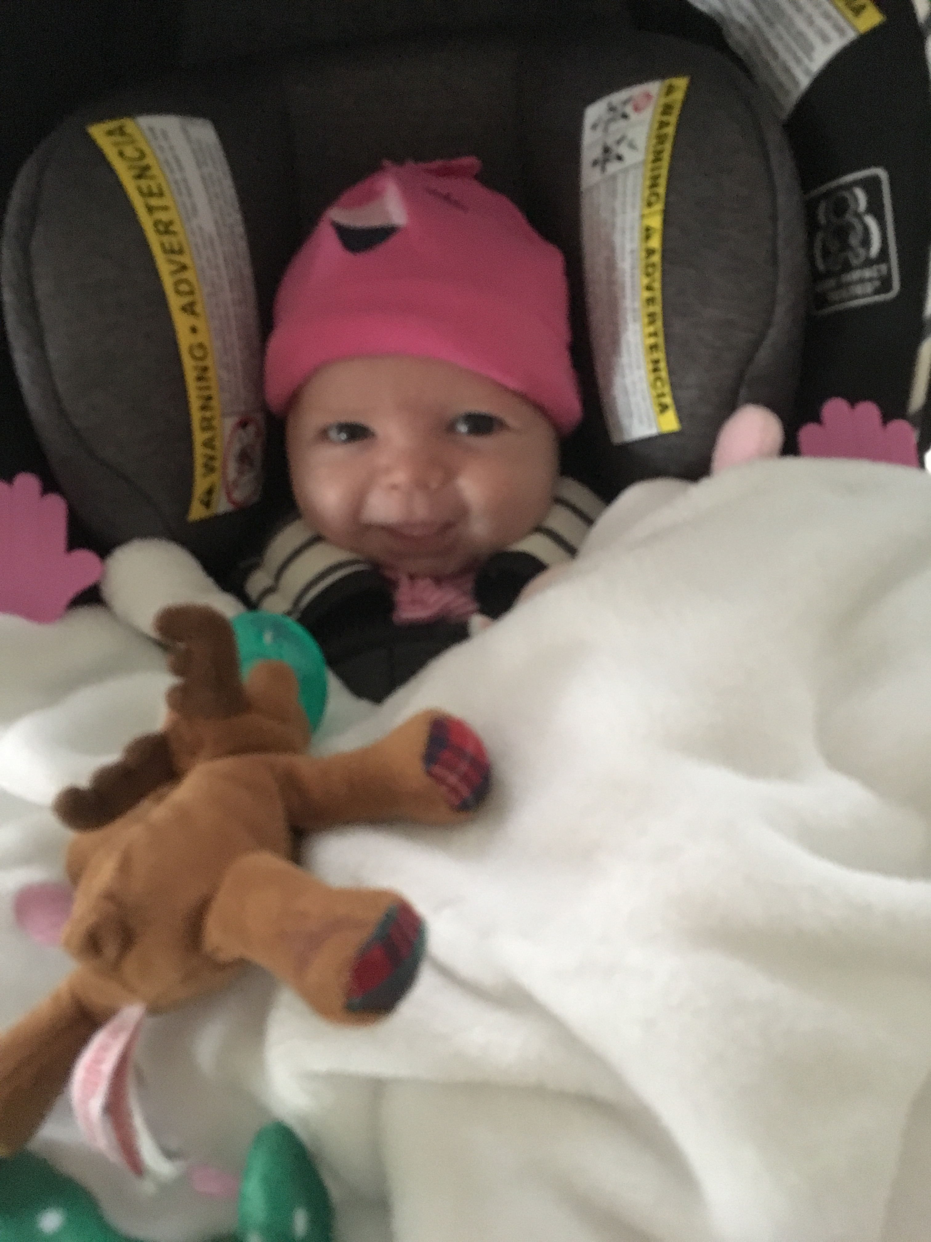 We ran lots of errands to get ready for the Christmas throwdown and party at the gym! I had to feed her in the parking lot and when I showed up to coach the 4pm K was actually still in her PJs…but we put her matching flamingo hat on because it was chilly for once!