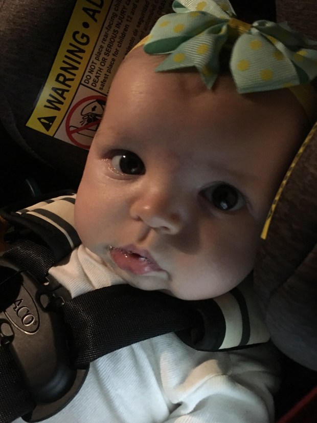 I’m learning her little quirks and tricks and I have noticed when I set her down she (usually) immediately fusses; however, if I walk away she gets quiet and will sit by herself just fine! If she sees or hears me (or if daddy goes up to her) she starts crying to be picked up again. I’m on to you, KB! Smart little cookie…This doesn’t apply when she’s having a meltdown, just when she’s “bored” at the gym sitting in her chair alone – wide awake!