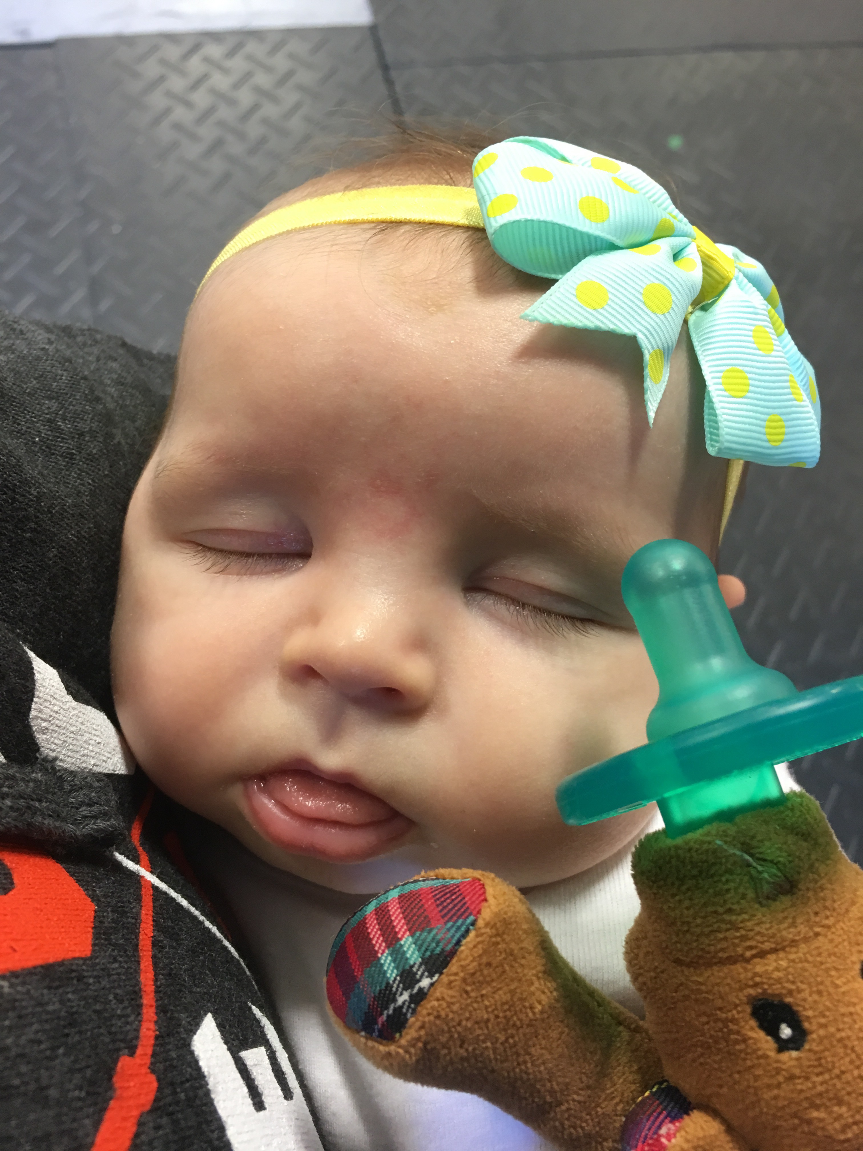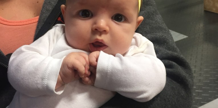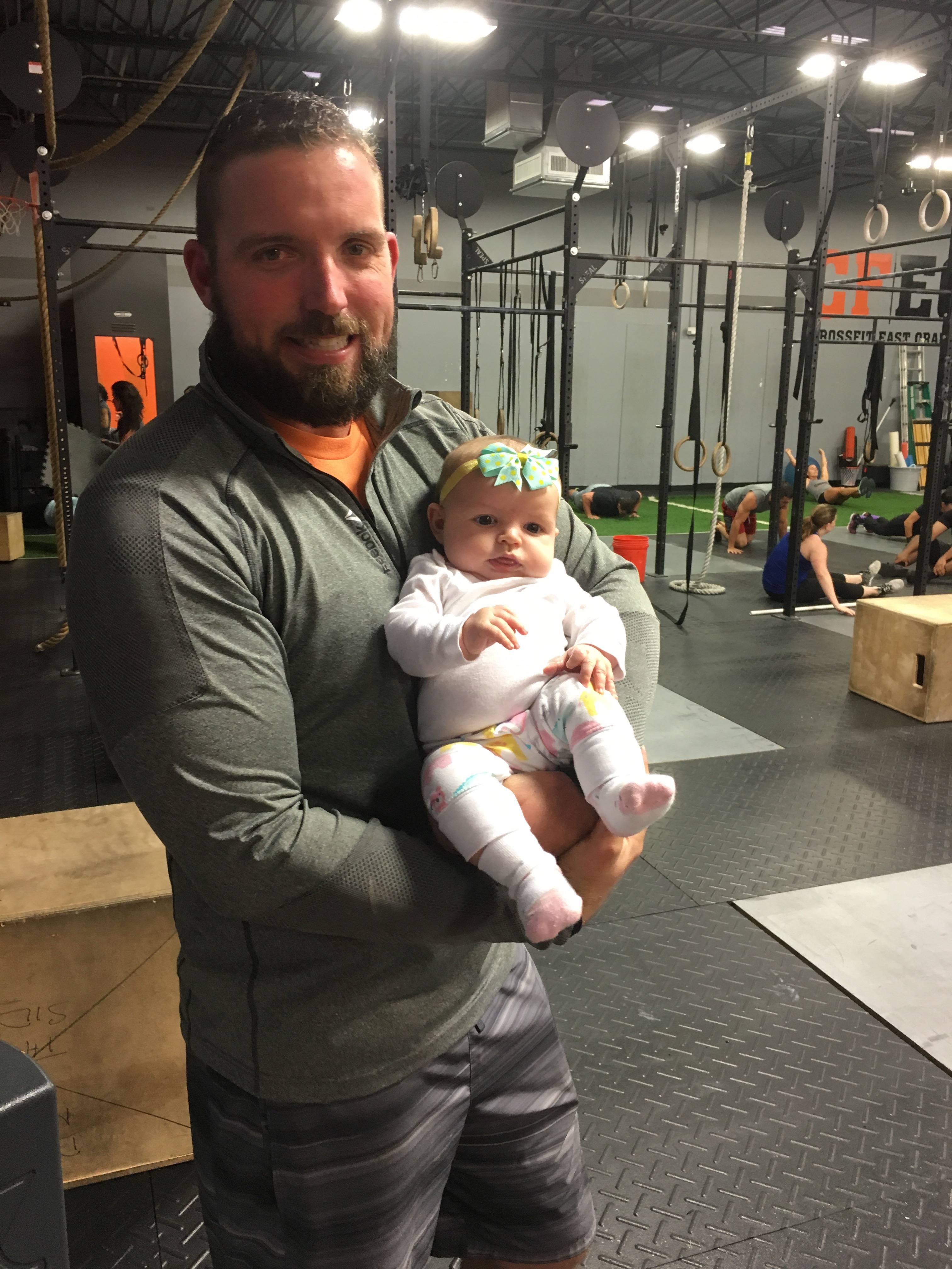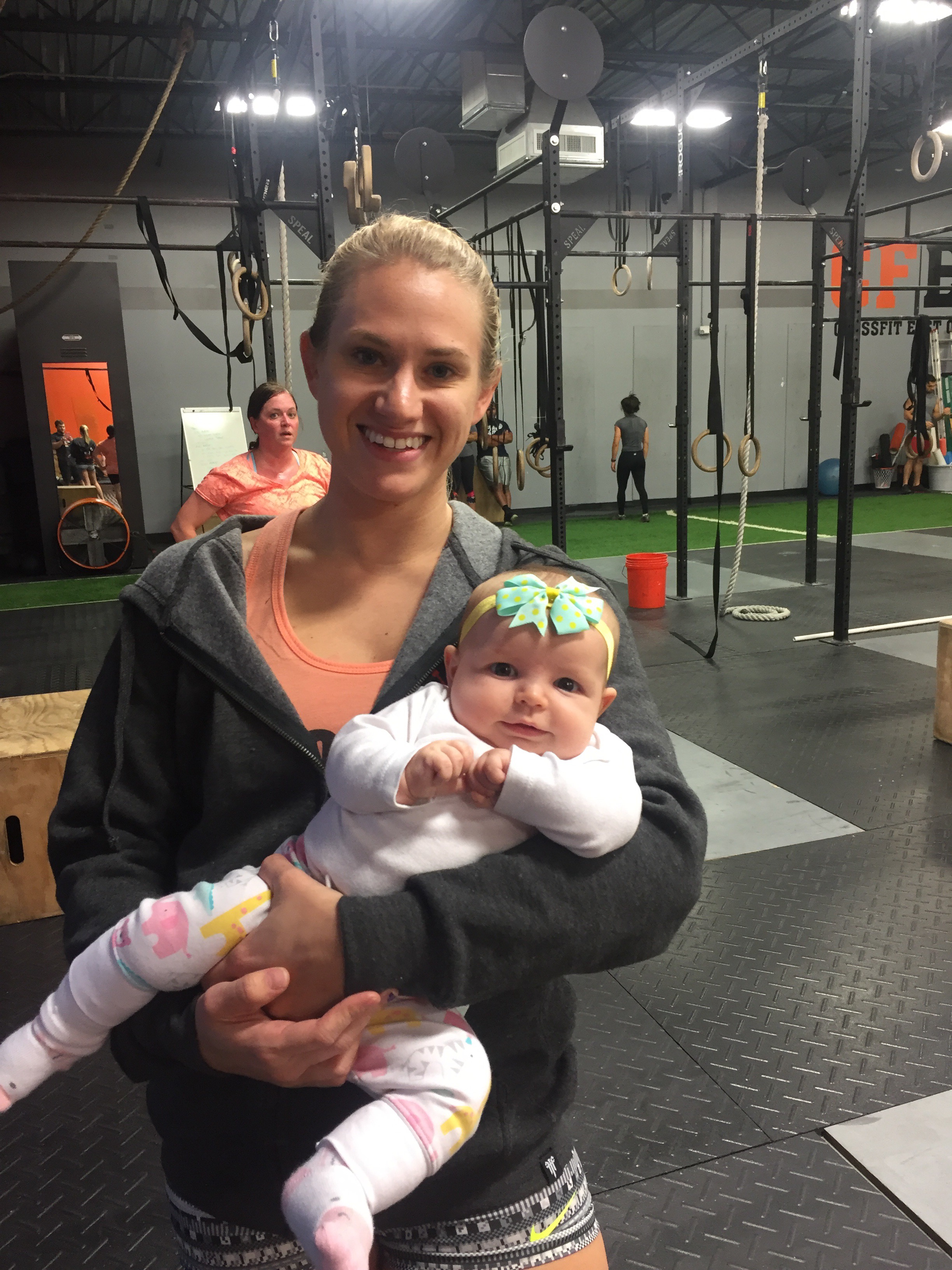 This afternoon Kensie was so good at the gym! She started to fuss a little as I was coaching so I picked her up and she passed out immediately. Then while I was working out, she hung out with Daddy and Aunt Char and was happy as can be just watching everyone!