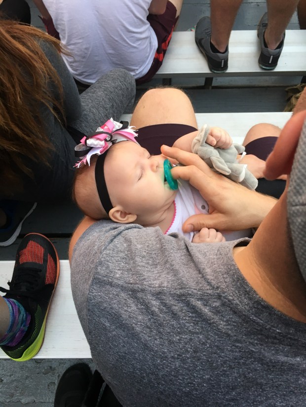 We spent this weekend in Miami at Wodapalooza! Kensie had a super cute Goat outfit on (a Goat is the mascot for our gym, CrossFit East Orange. It stands for Greatest Of All Time), but she had an explosion at lunch and had to change. The best part was the BBQ place we were eating at had no changing tables and a really small bathroom, so I had to change her on the bench of a picnic table in the restaurant. Classy.