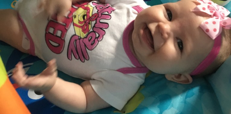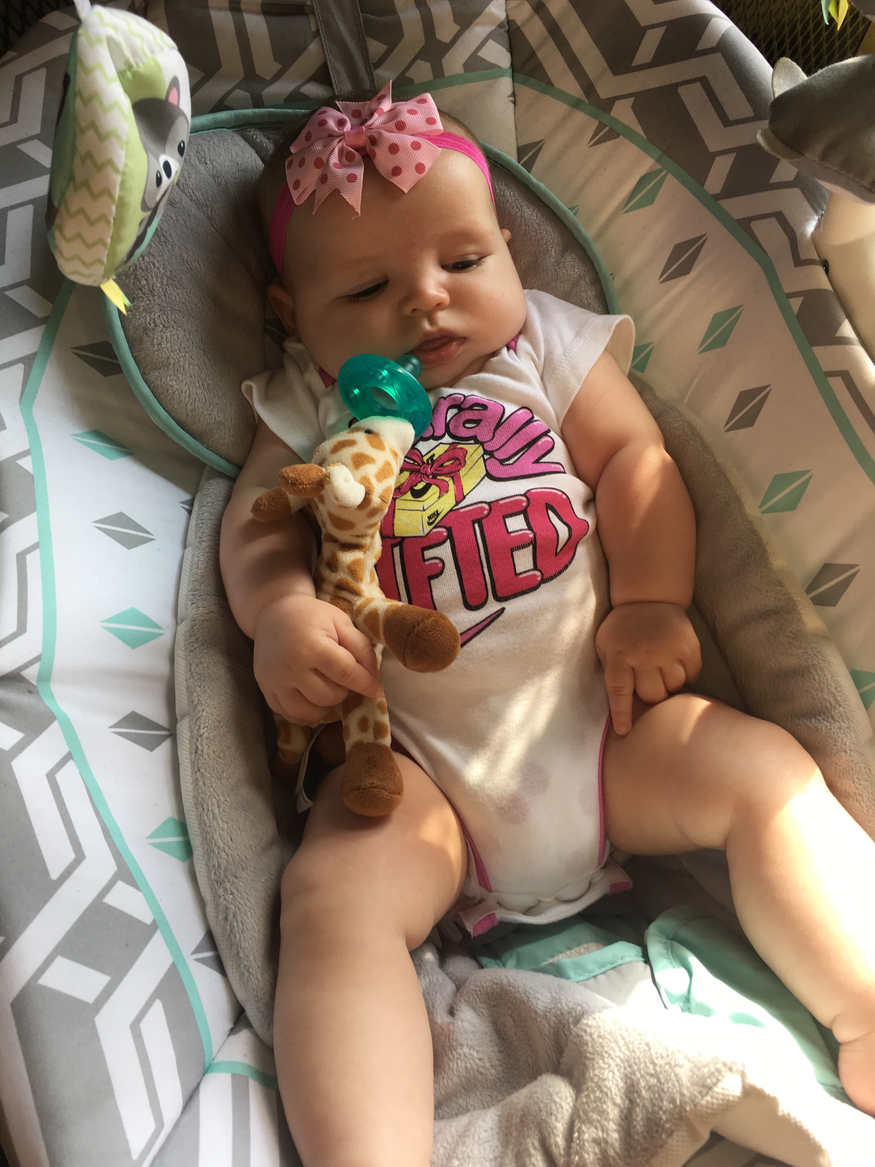 Seriously, she wins with it every single time. When Kensie is in her swing at the gym and she’s tired, she’ll fuss a little until her pacifier is in her mouth. But if you make eye contact while giving it to her – she cries her way into your arms.