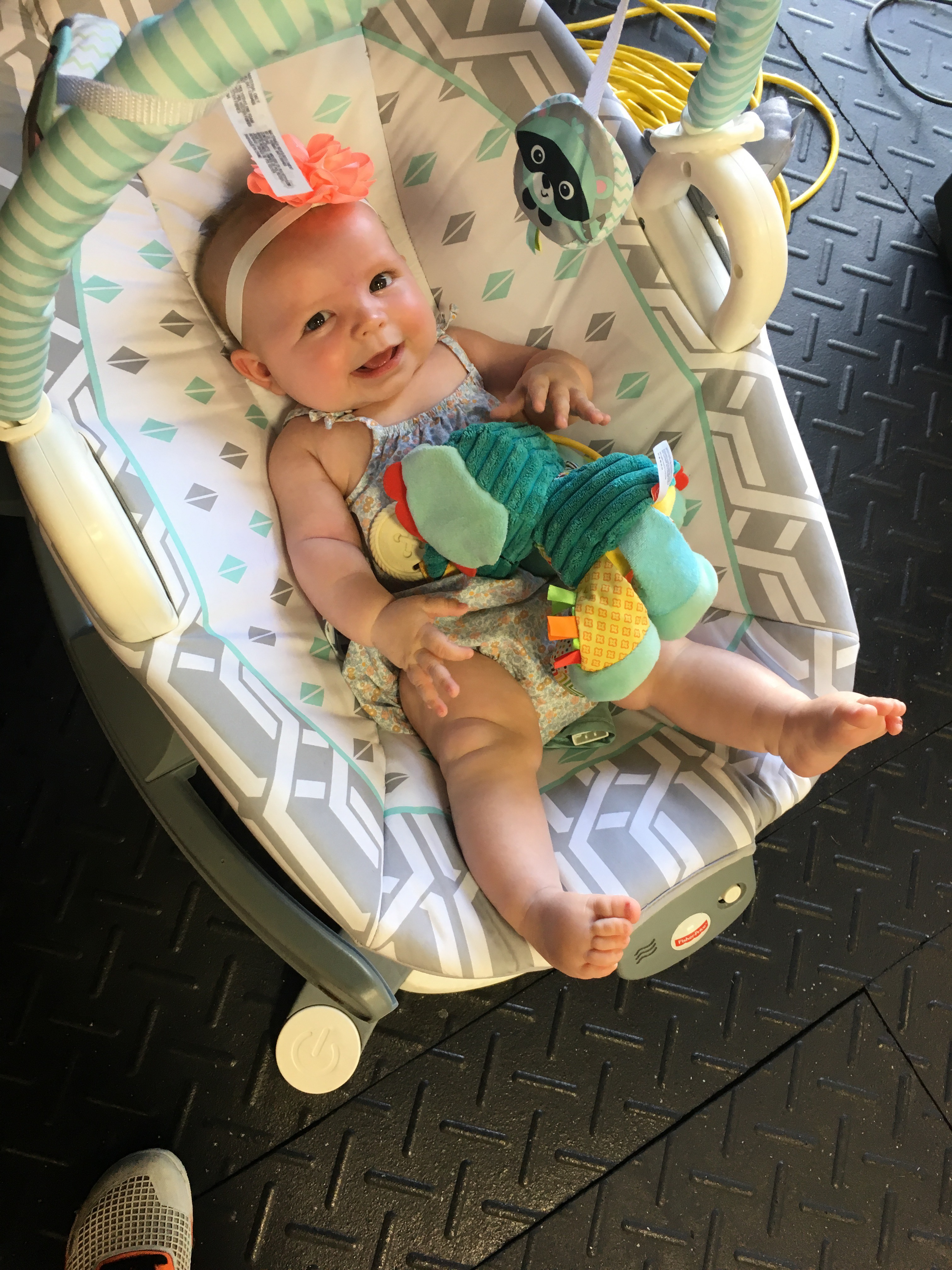 “Who’s ready to party guys? Play with me!”The self entertainment only lasted about 15 minutes today.K has been loving naps in the ergo baby at the gym; so when she got to her non-stop fussy phase of tired, I put her on and she went right to sleep! I think it’s the combination of being held and it also blocking her sight some so she can relax. It’s wonderful while I coach. It’s not so wonderful when I want to workout. We improvised today.
