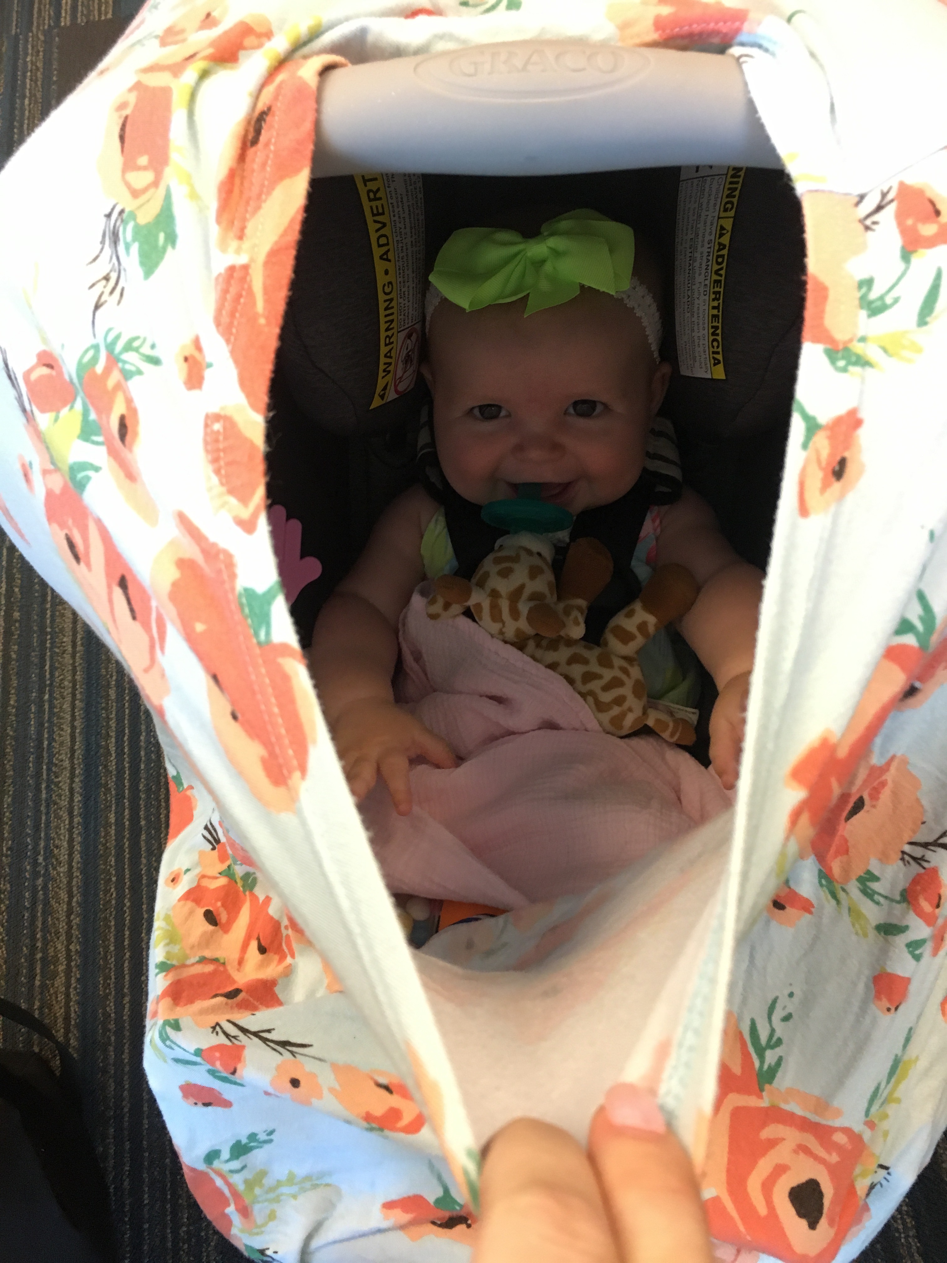 Kensie fell asleep on the way to her doctor appointment so I put the cover over her car seat in an attempt to keep her napping but it was an epic fail. She things this thing is for peekaboo so she just cheeses when you look in at her and thumps her leg up and down if you don’t.
