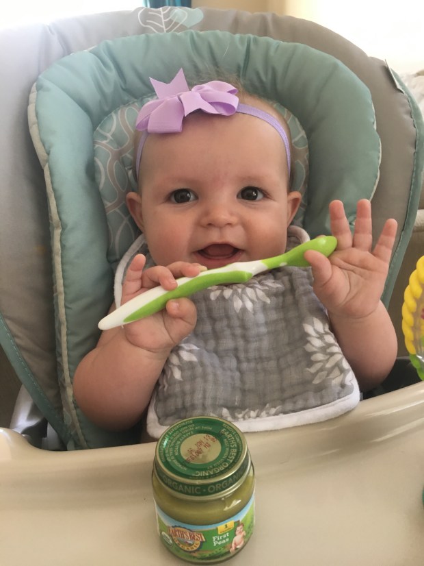 Mom – 2, Kensie – 0K had peas for lunch today and she LOVED them! A friend gave me a really good idea before I make food for Kens – to buy different ones first to make sure she likes them before I waste my time. So far, we’re 3 for 3!