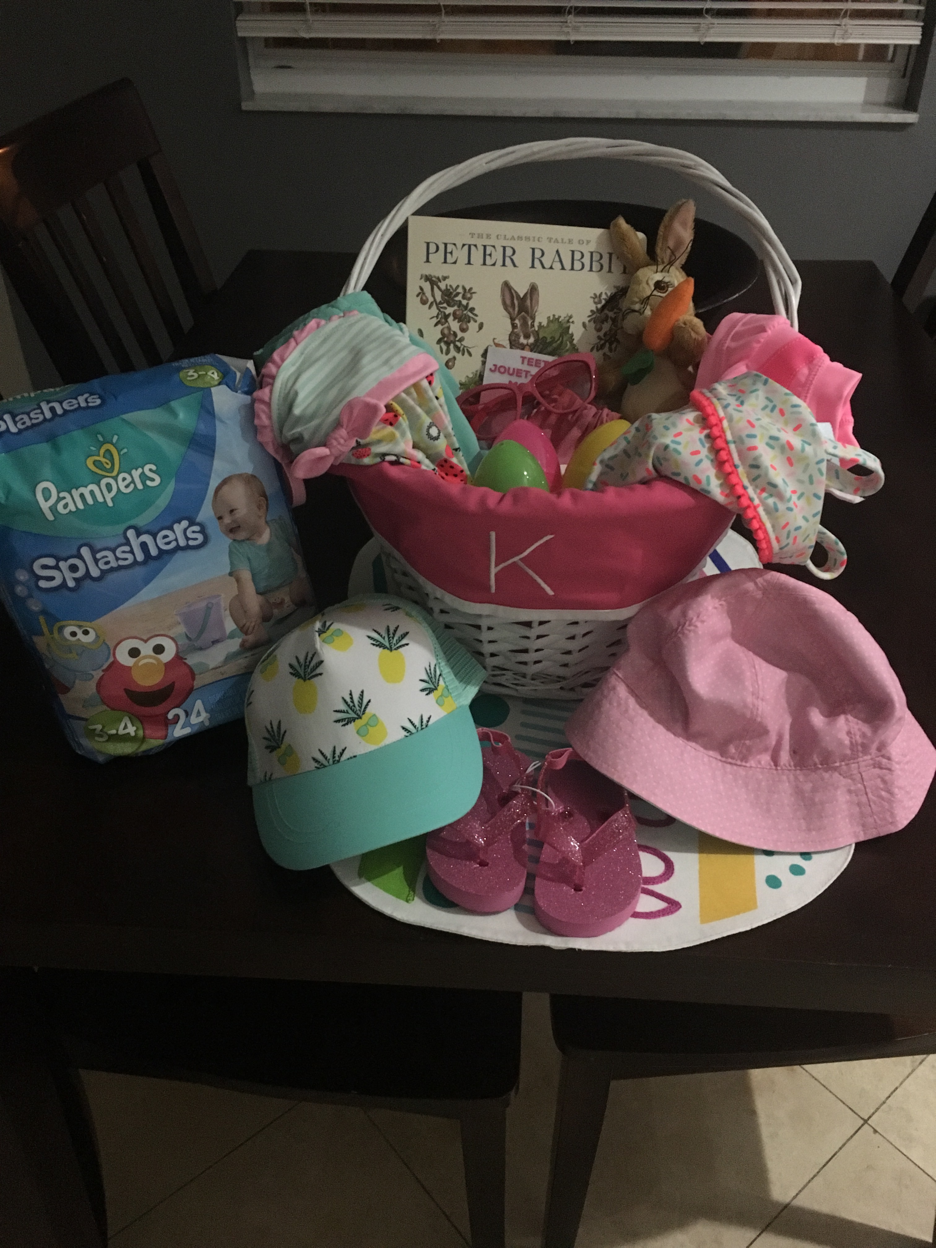 Growing up we always got things to play with outside in our Easter baskets so I figured I’d carry on the tradition…I mean the “Easter Bunny” would carry on the tradition…so K’s all ready for swim lessons and summer days by the pool!