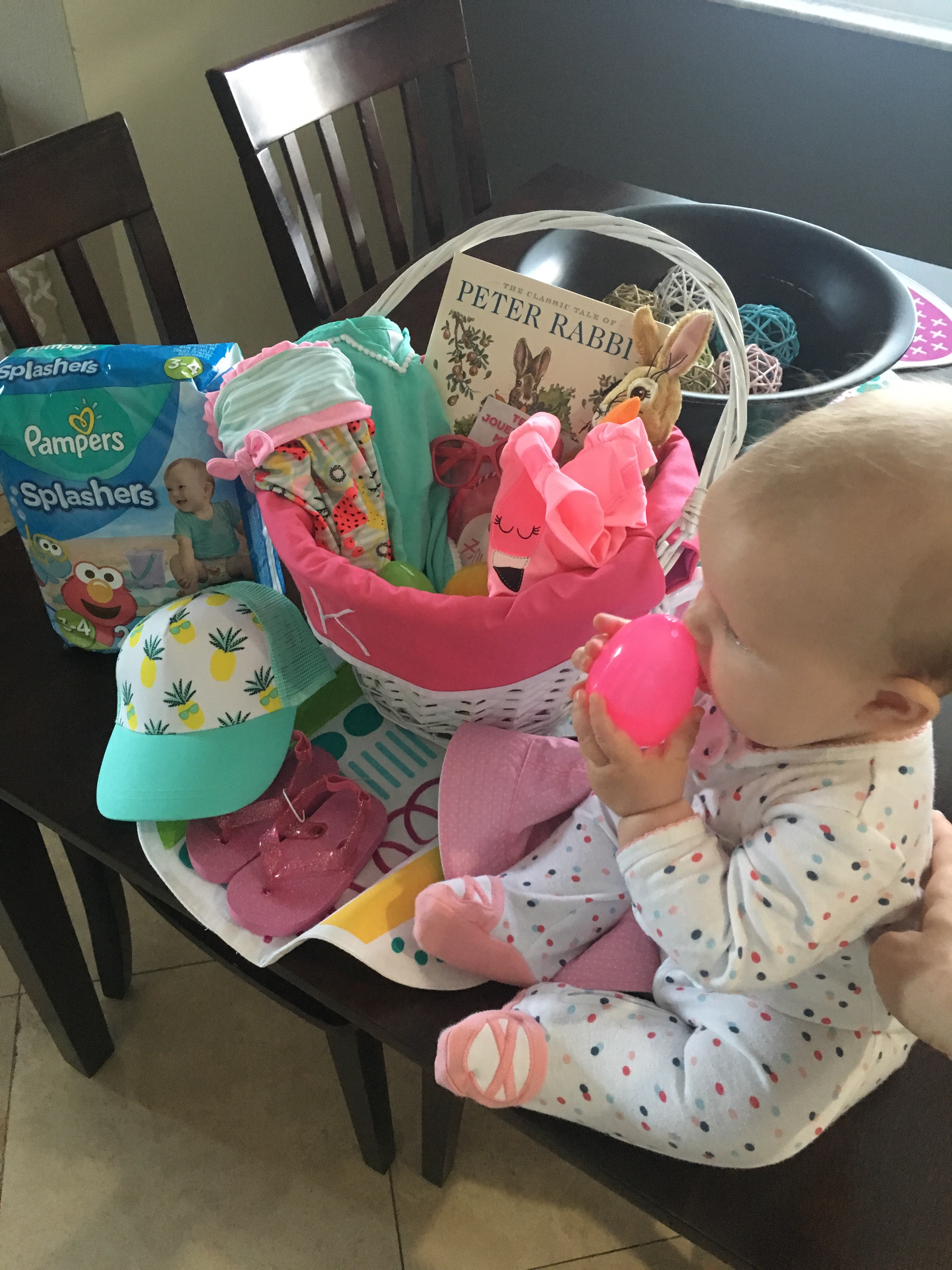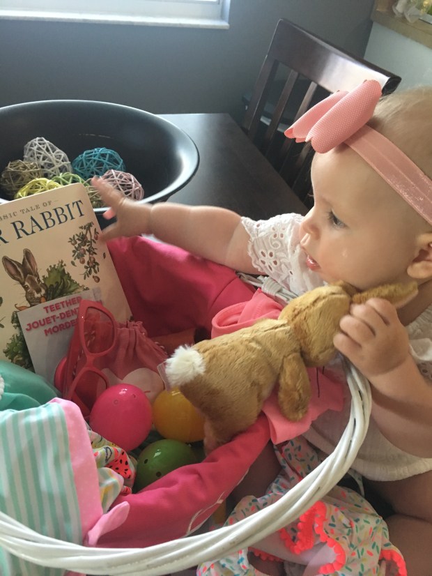 Kensington had the best first Easter!!! We made her an Easter basket (don’t tell me she’s too young for it to matter – I do what I want!) and she loved pulling everything out of it this morning!