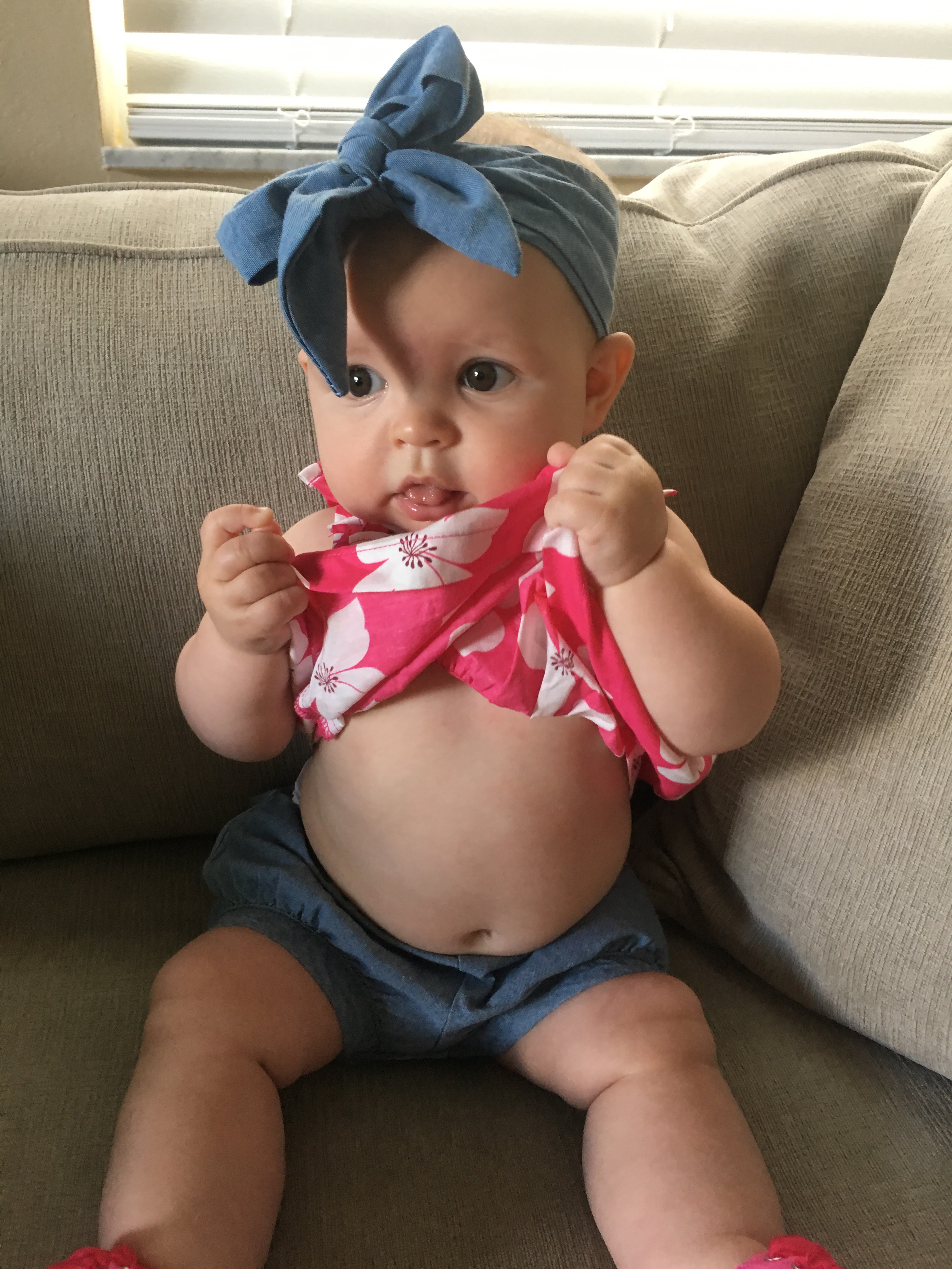 Kensie developed a new trick today. It was a wholeeee new kind of blowout. She was sitting in her bumbo so I figured it went up her back. Oh no. She missed that completely. It somehow just came all the way over and out and on to the back of her shorts. π€