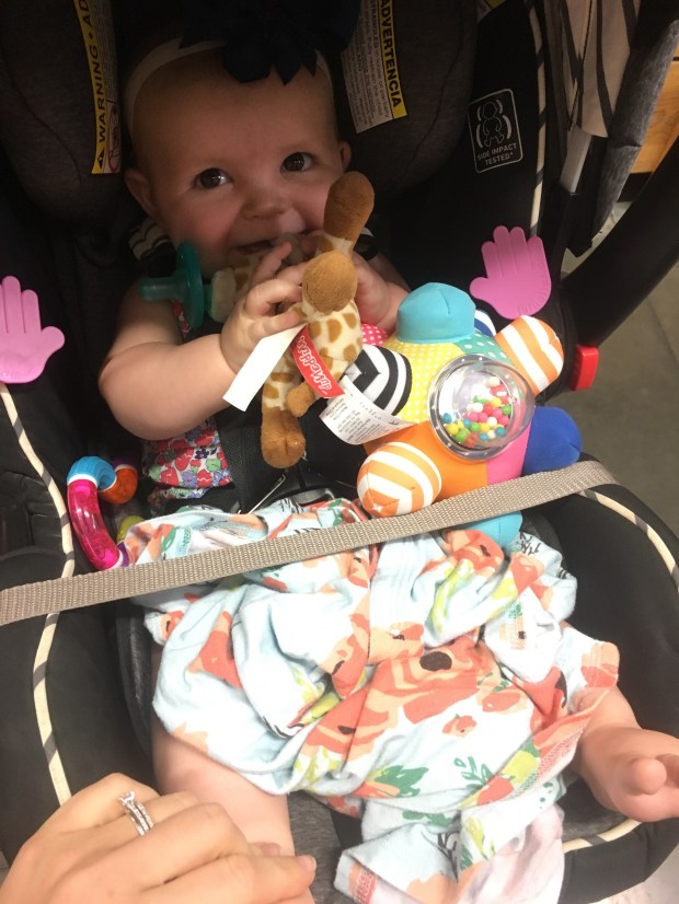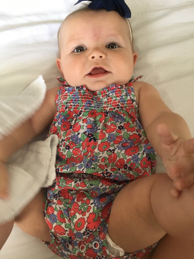 Kensie rolled from her back to her front today!!! Not going to lie, I was a little worried she’d skip that step. She doesn’t care to be on her stomach most of the time and loves being on her back so I didn’t think she’d try. After lunch she was a happy Rollie pollie and kept going back and forth like she’s known how to do it for weeks! Except for when I tried to video her, of course.