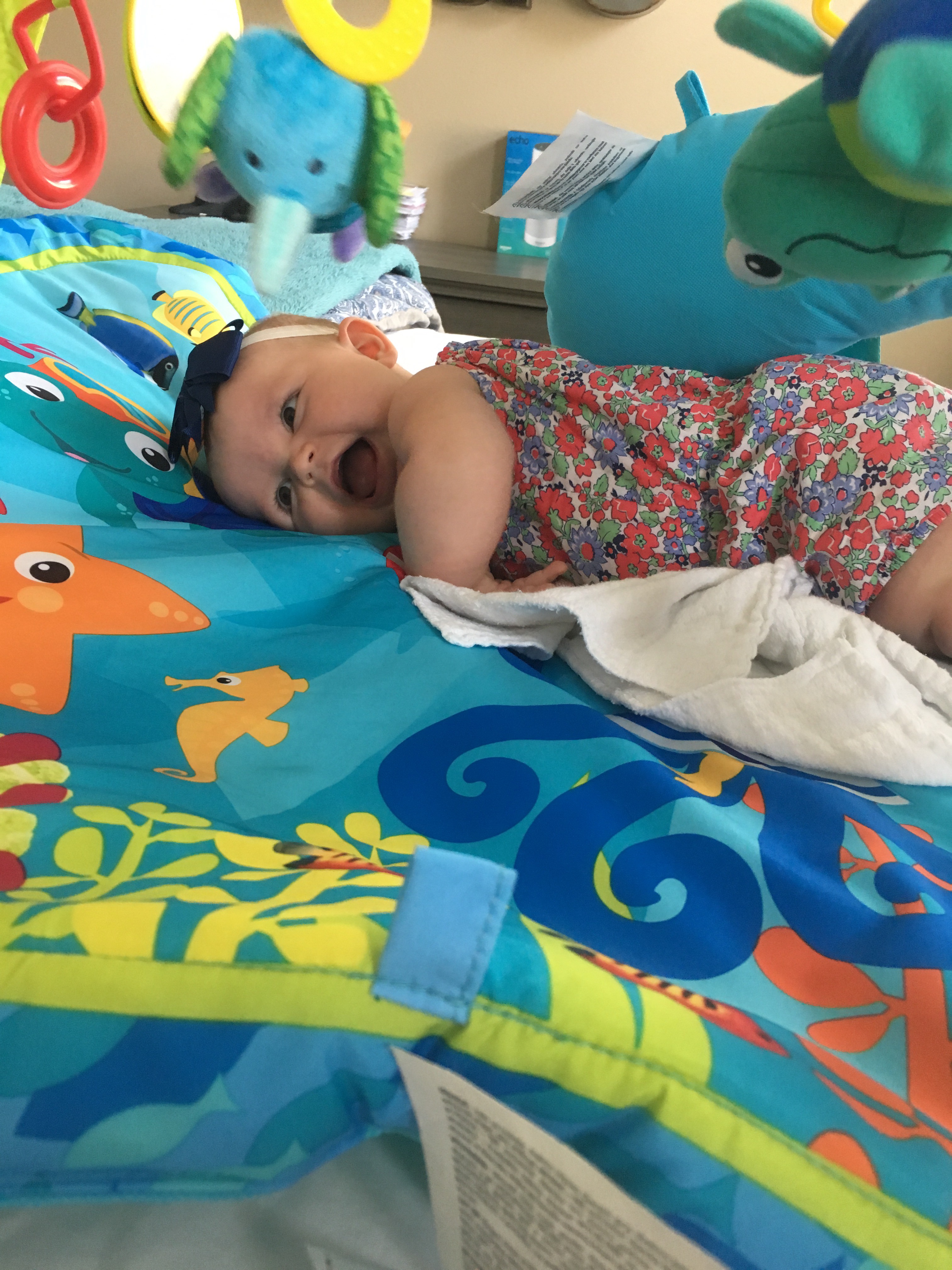 Kensie rolled from her back to her front today!!! Not going to lie, I was a little worried she’d skip that step. She doesn’t care to be on her stomach most of the time and loves being on her back so I didn’t think she’d try. After lunch she was a happy Rollie pollie and kept going back and forth like she’s known how to do it for weeks! Except for when I tried to video her, of course.