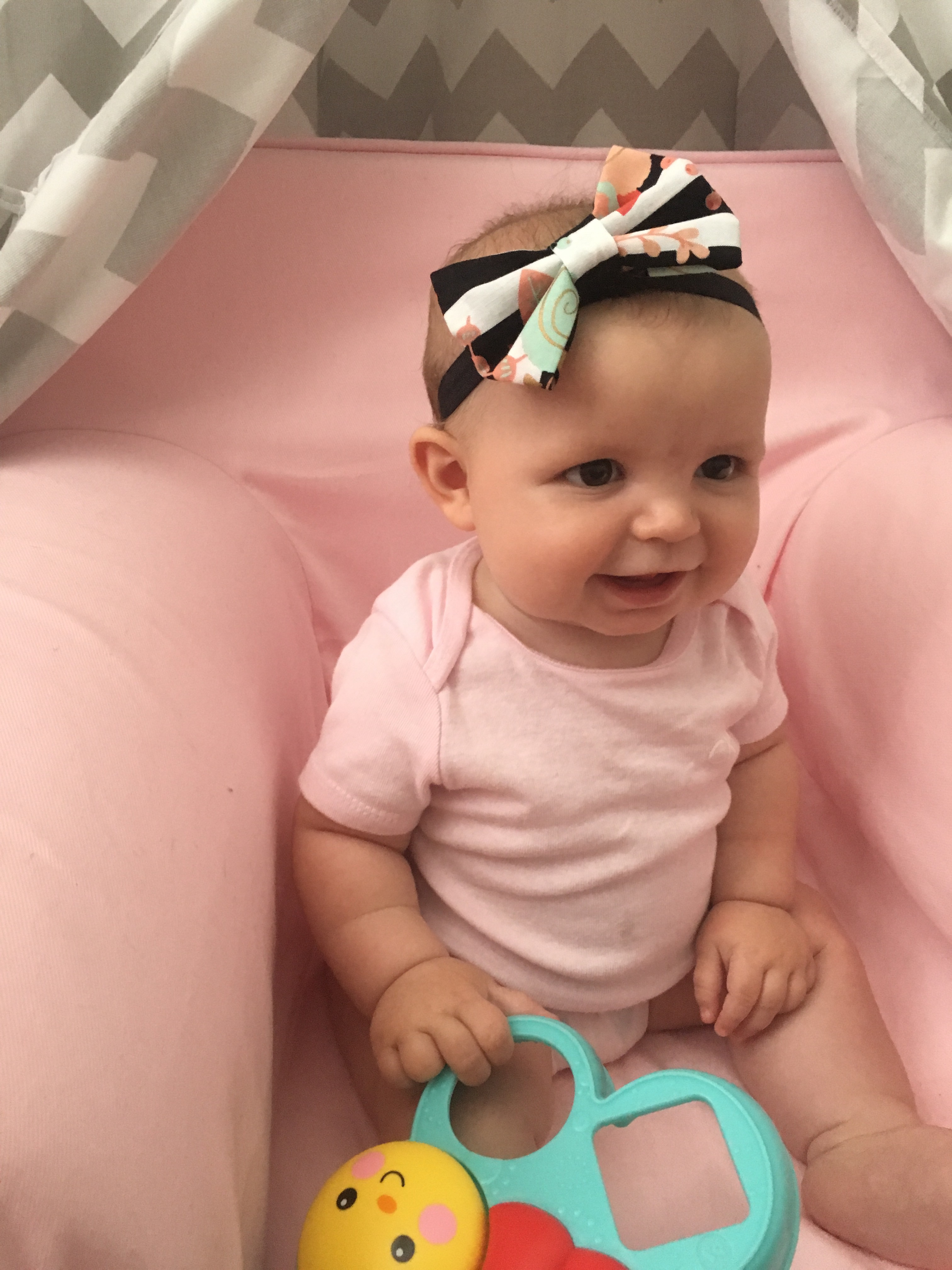 We went to the gym at 5am today…so she rocked her PJs. No worries, she put on a bow later. It’s one of my favorites from the new Bows of Kensington shop! (We’re still under construction…)