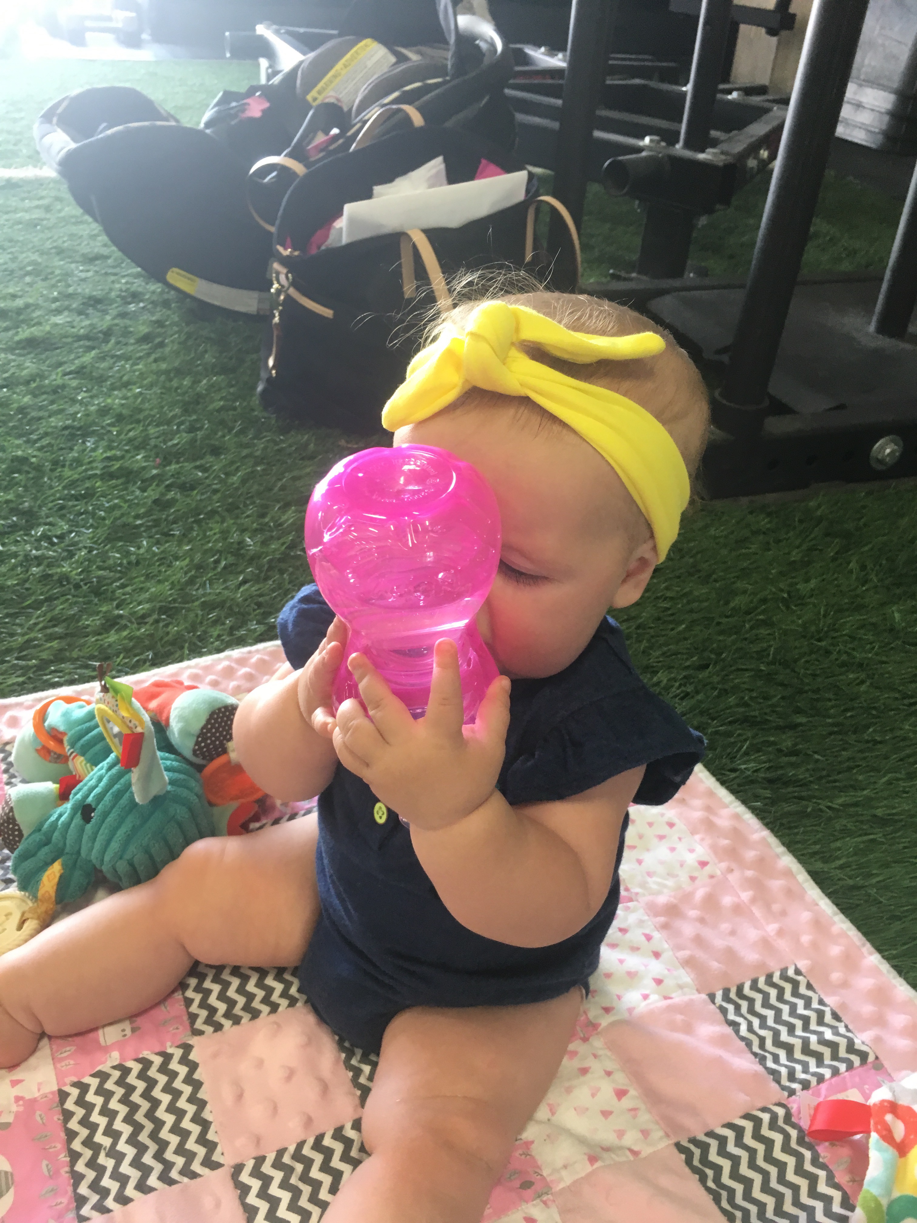 Kensington has been in full on party mode for Memorial Day weekend; watching TV upside down, holding her bottle with her feet and trying to brunch. Whatever works, K.Had to show off for GrammaHer new favorite: drinking out of my water cup.