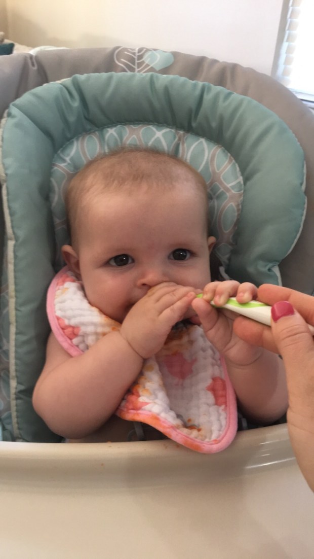 She’s getting so good at eating and is actually swallowing her food now instead of drooling it out!