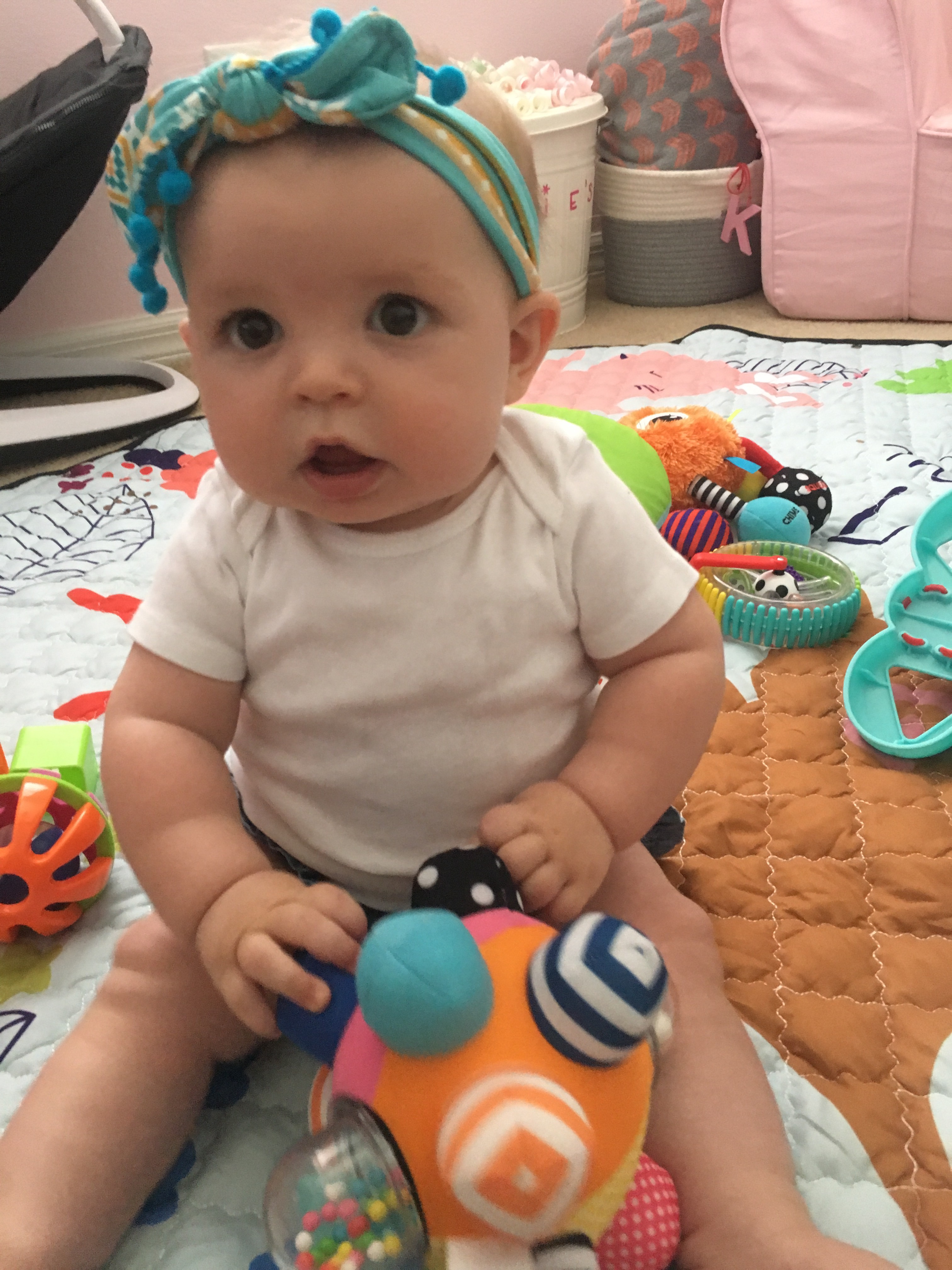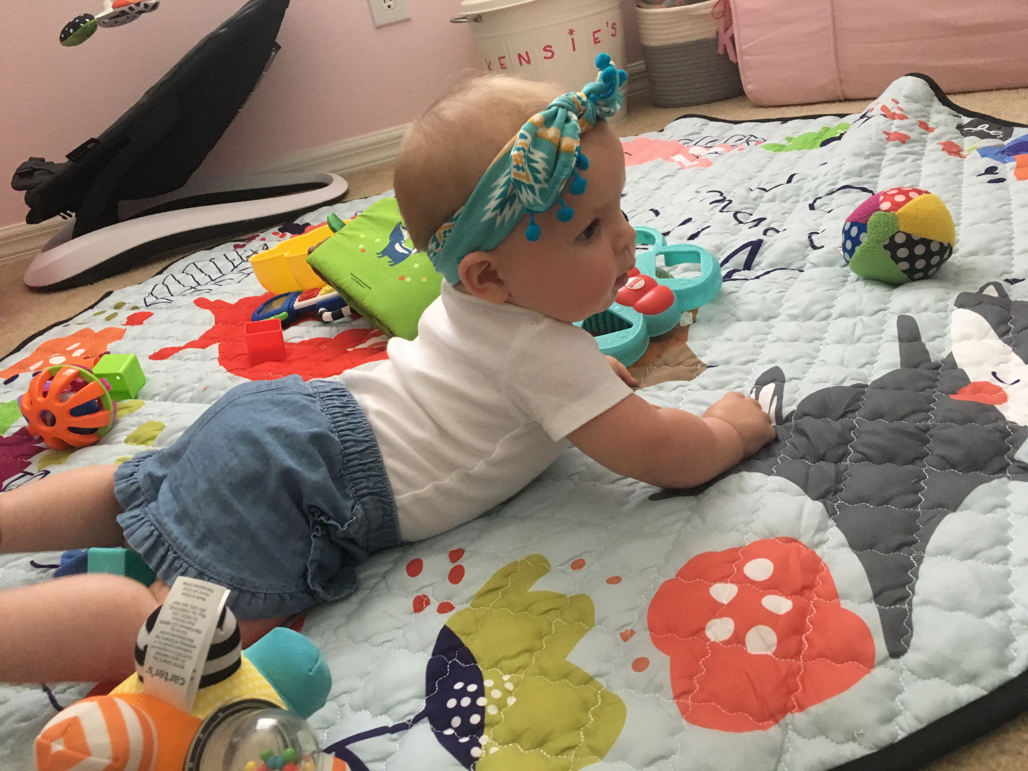 She now turns from sitting to her belly and is starting to army scoot to get what she wants. I think we are going to have a crawler in the next month!!