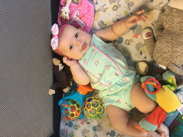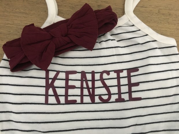 When we got home, Kensie went right back to playing while I worked on some new outfits for our Bows of Kensington shop! I got some adorable rompers from Old Navy and wanted to snazz them up a little – and OF COURSE make sure they had matching bows.