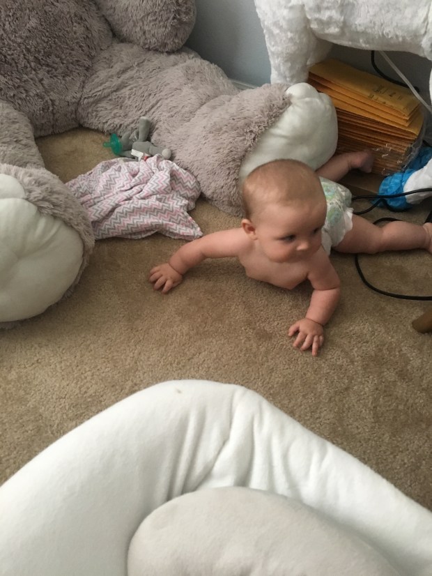 Kensie is still working on figuring out her crawling/scooting/getting where she wants to go skills. If she’s on her stomach, she just slides backwards.