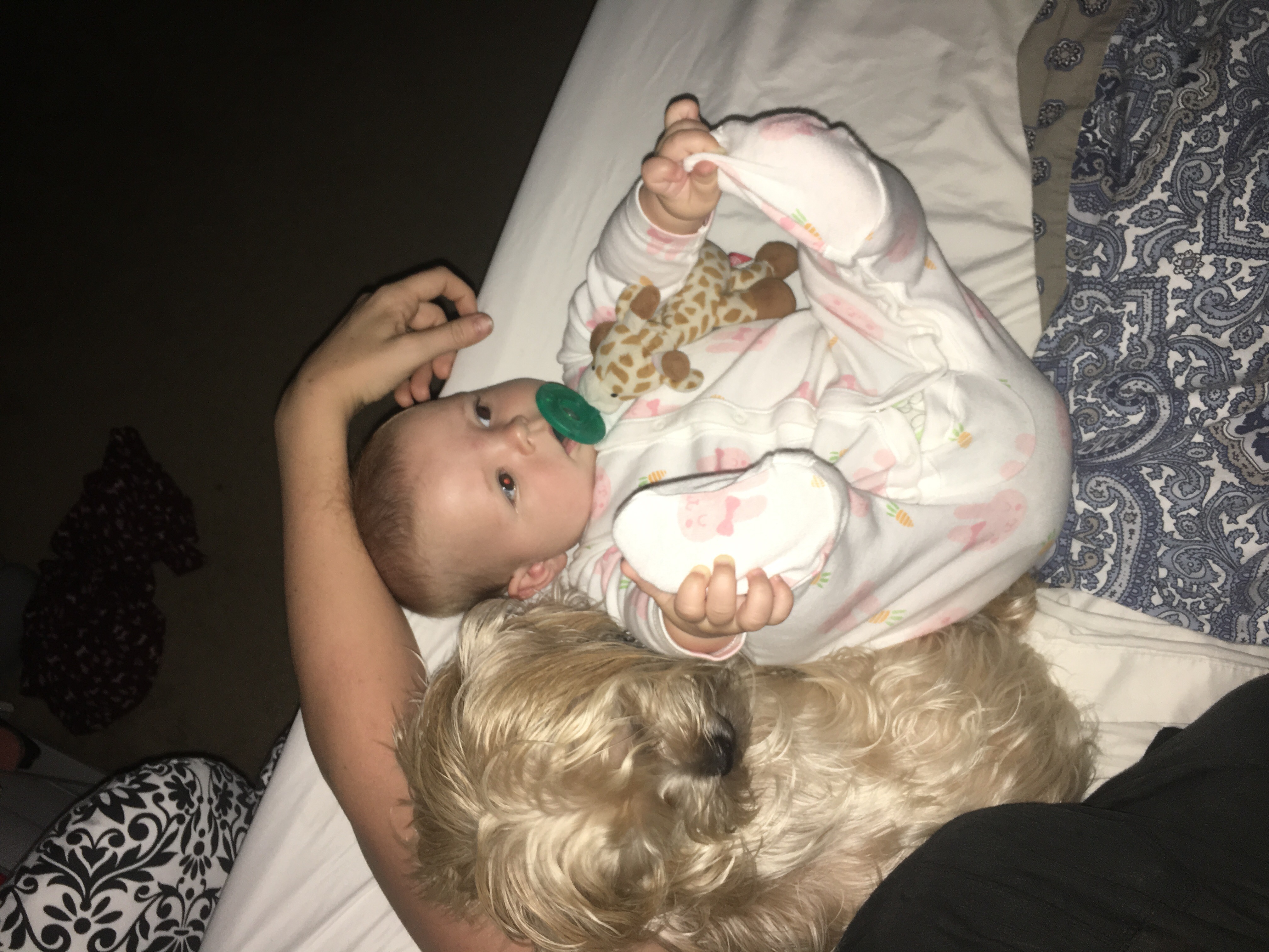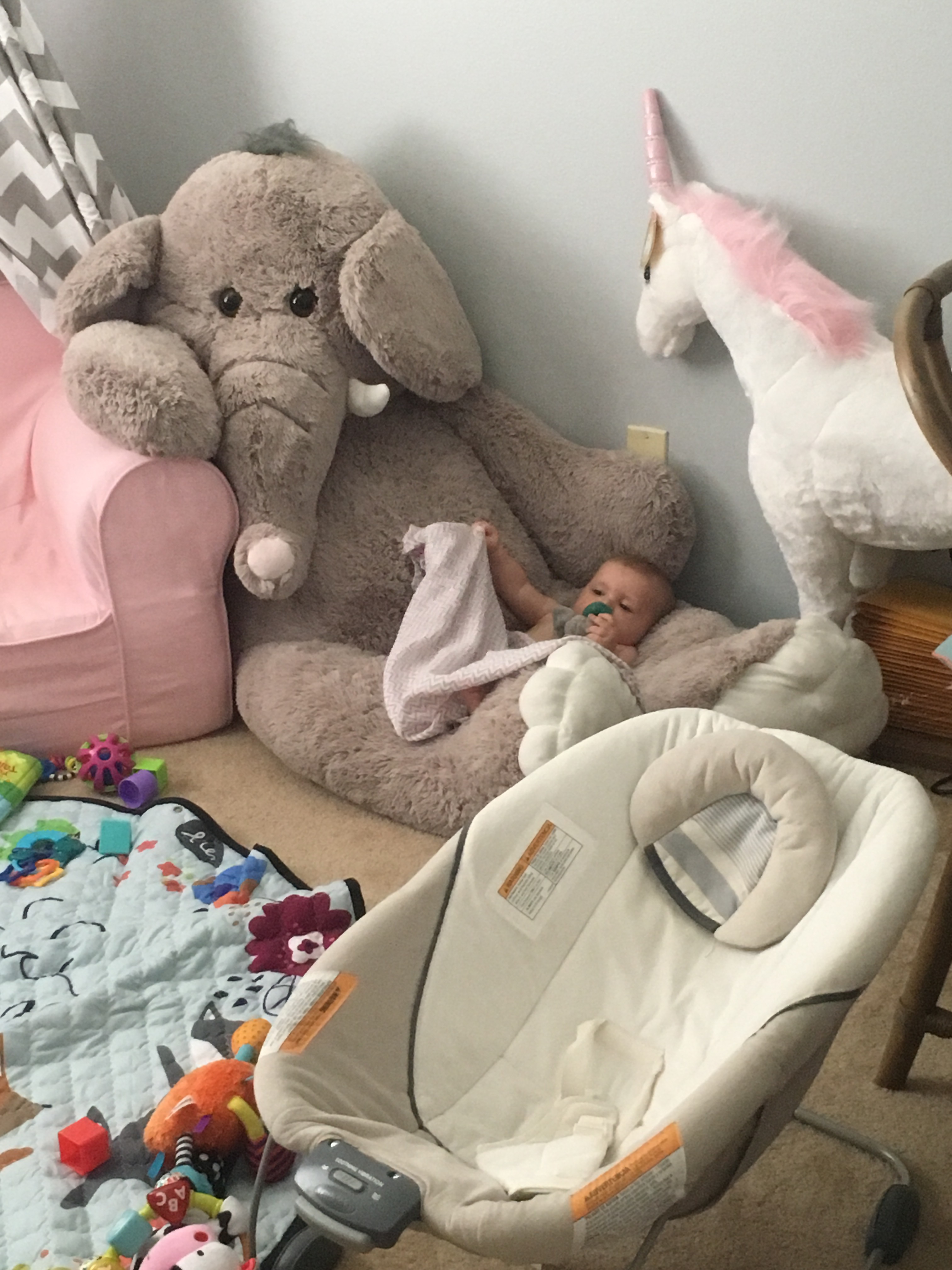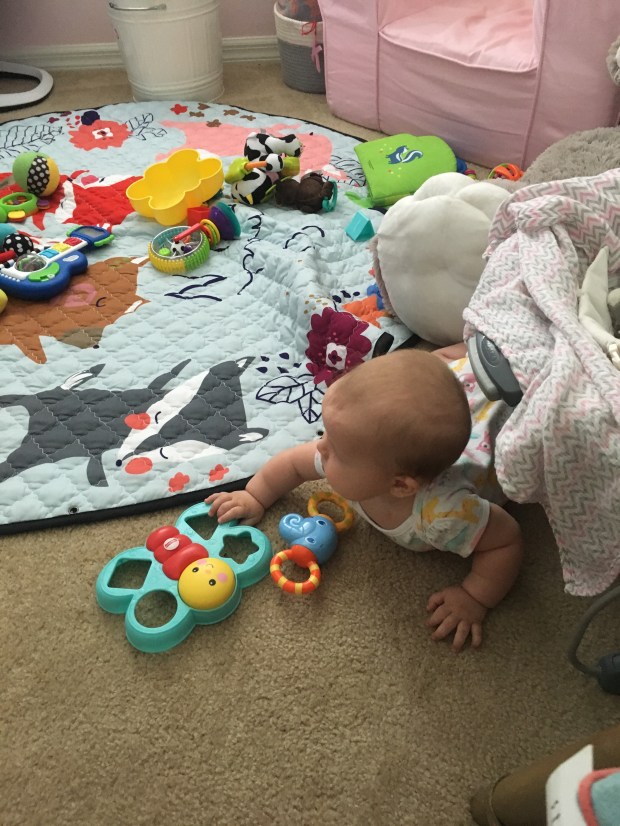 Kensie is still working on figuring out her crawling/scooting/getting where she wants to go skills. If she’s on her stomach, she just slides backwards.