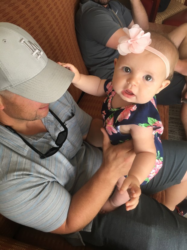 Kensie sat in a high chair at the table for the first time!! She kept herself entertained with the menus and then we got her some avocado to eat.