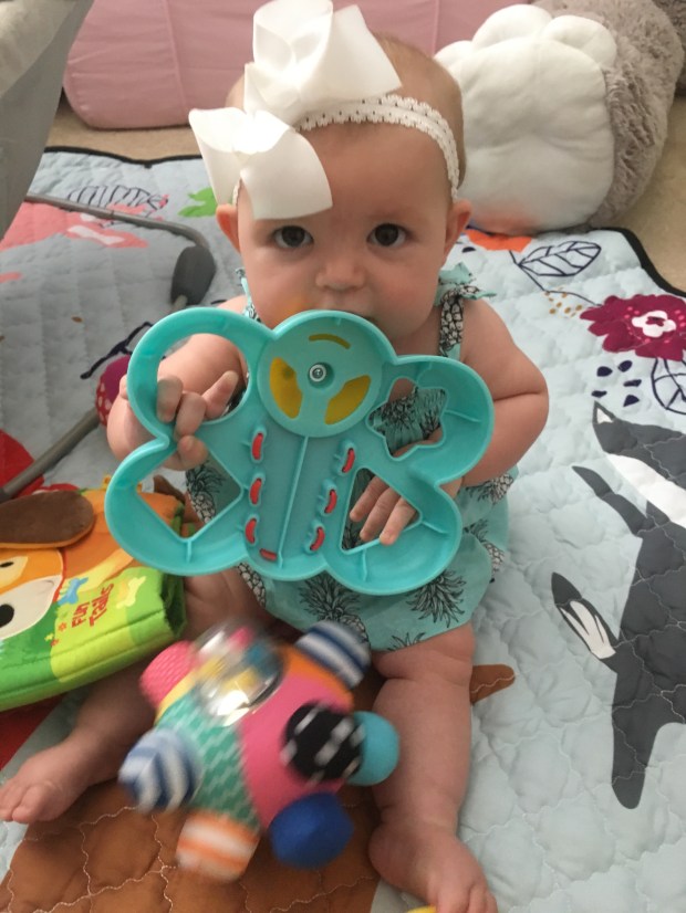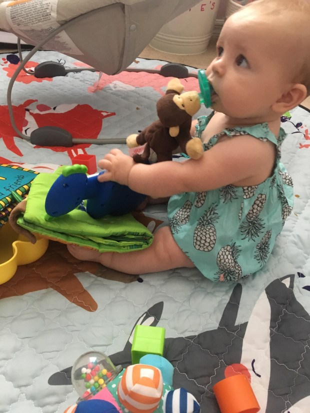 She now turns from sitting to her belly and is starting to army scoot to get what she wants. I think we are going to have a crawler in the next month!!