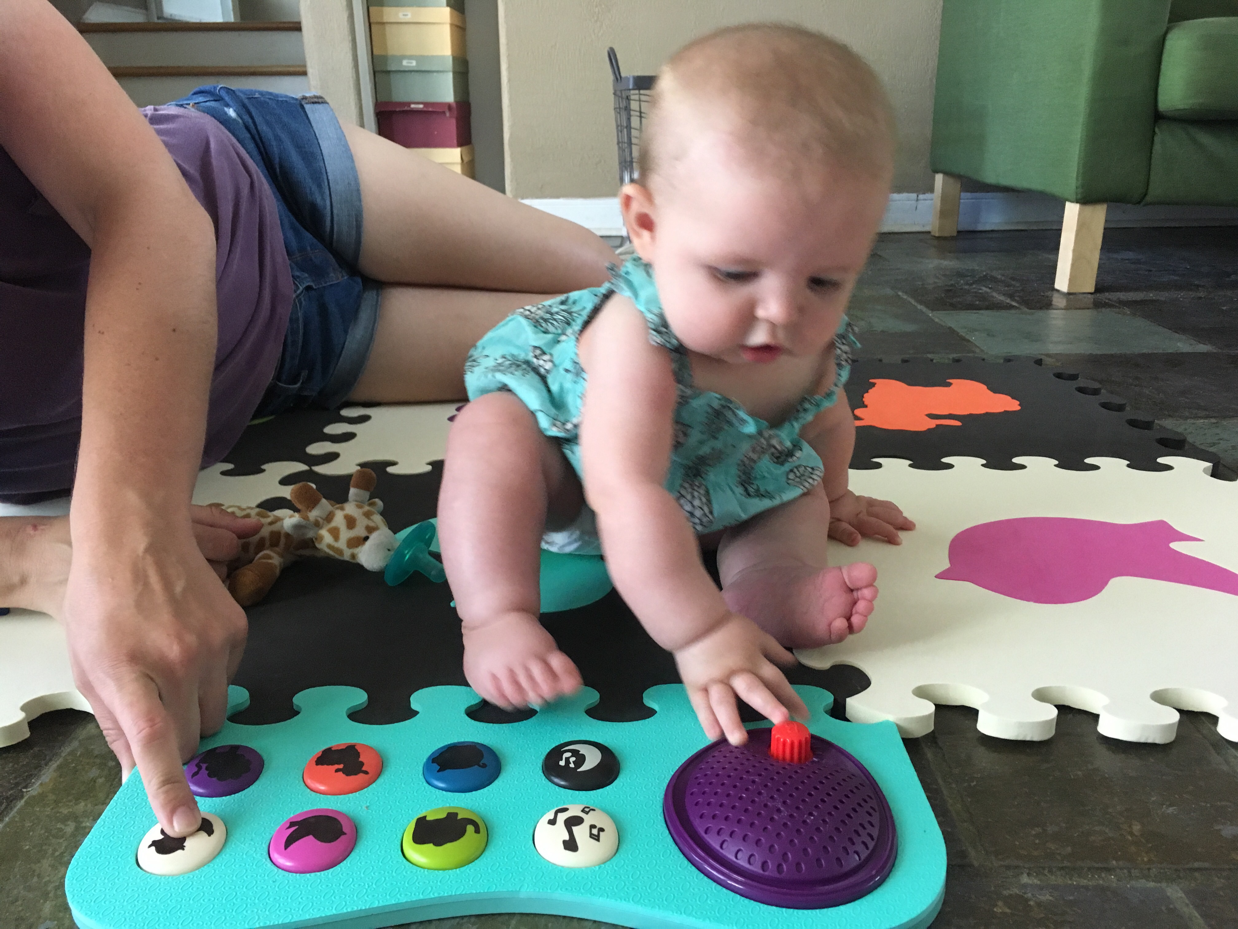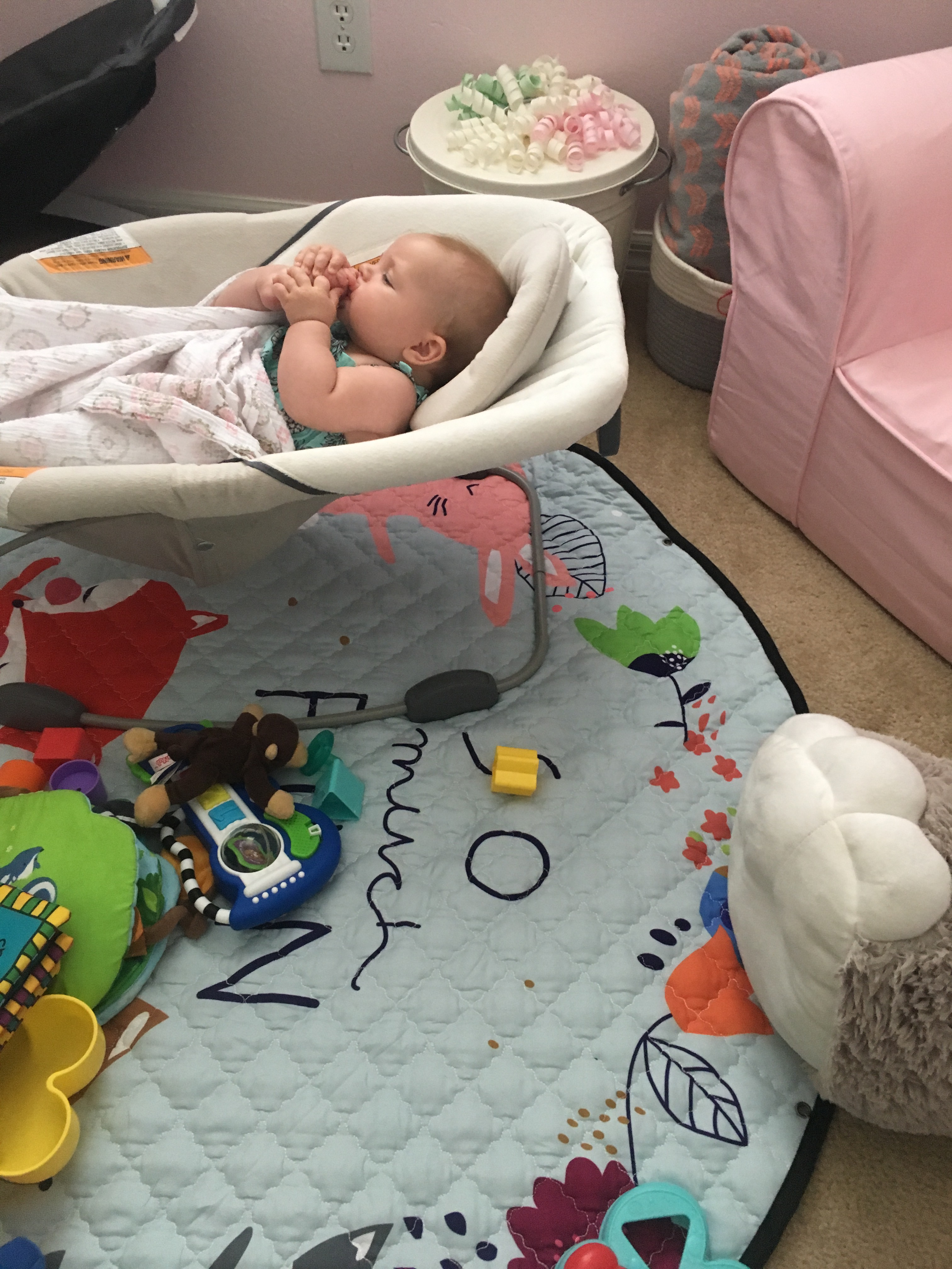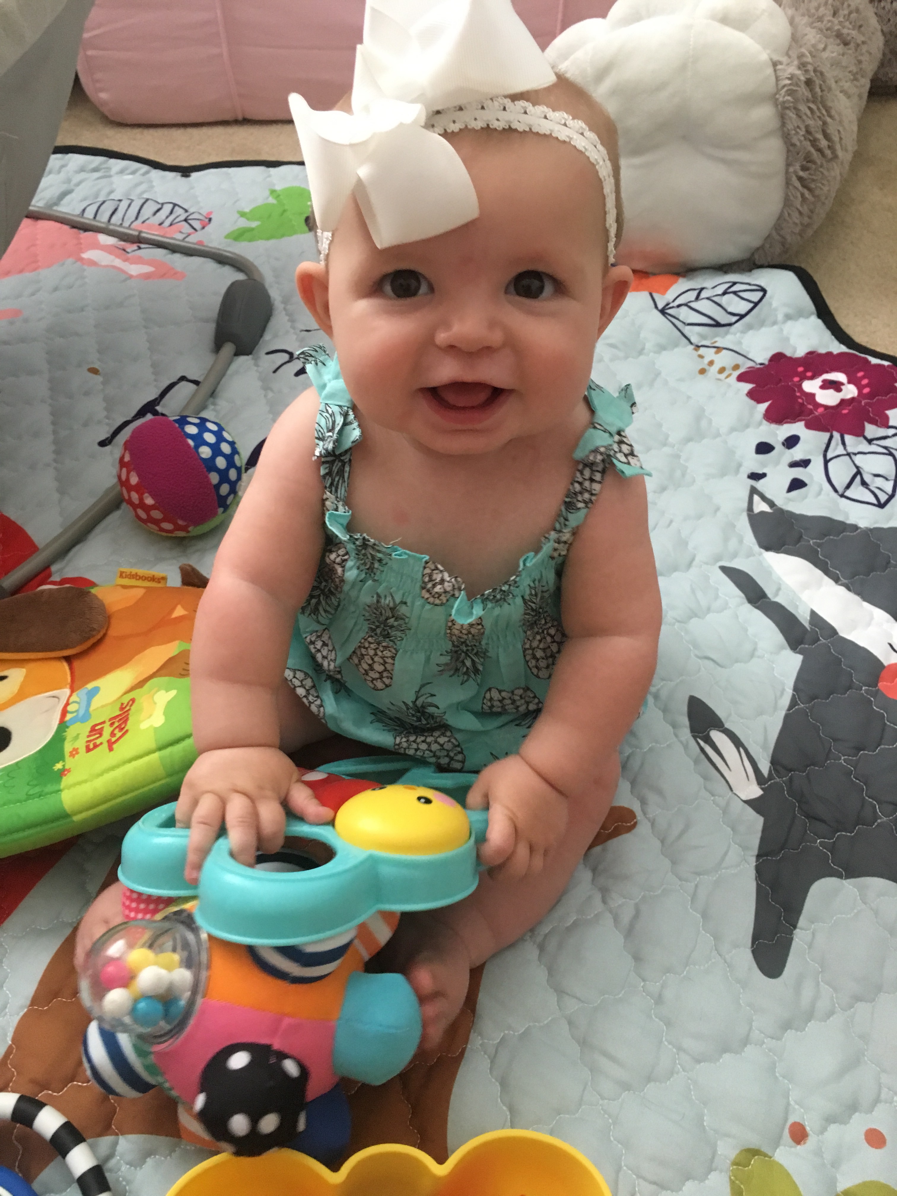 She now turns from sitting to her belly and is starting to army scoot to get what she wants. I think we are going to have a crawler in the next month!!