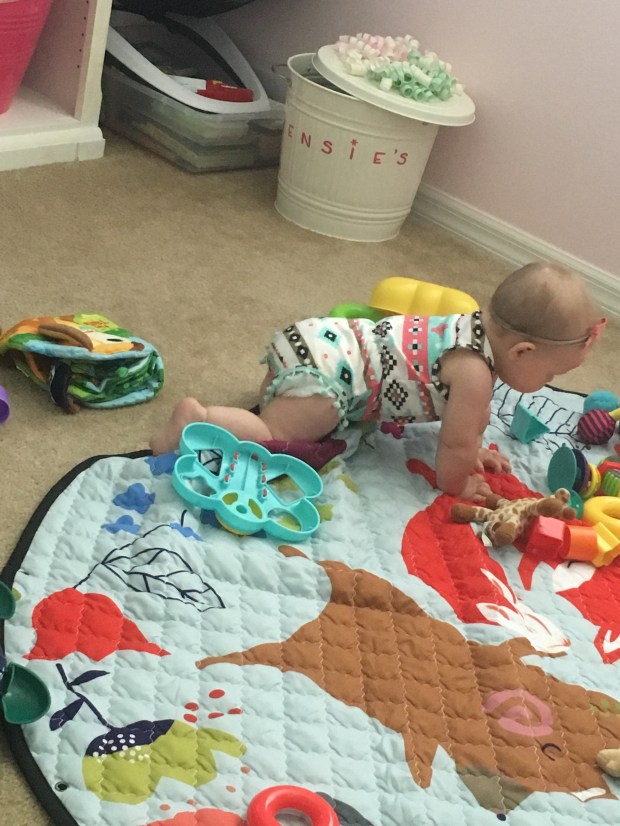 Such a boog. In between her crankiness, she got closer and closer to crawling!! She finally took ONE crawl “step”? (Is it called that?) Anyways, after that she crawled backward across the room. 🤷🏼♀️
