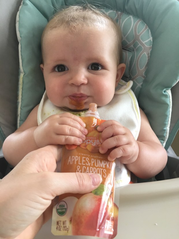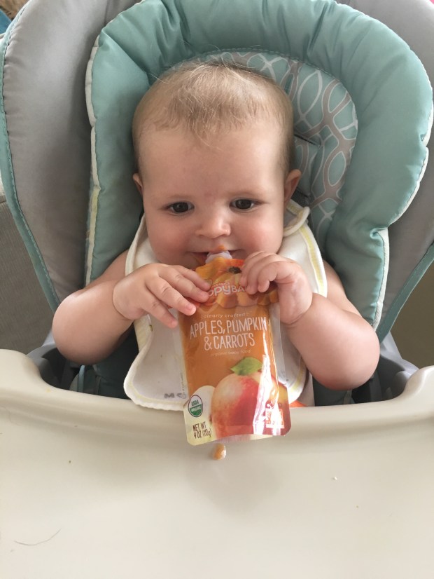 I picked up some squeeze pouches (I don’t know what they’re called) of food for “on the go” days and wanted to see if Kensie would eat out of them since she’s only ever been spoon fed.