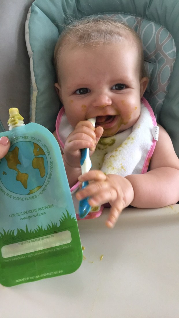 Until she wasn’t. On the bright side – she LOVES pouches! K likes that she can put them in her mouth all by herself; however she also turns them upside down and pours all of the food out. π€¦πΌββοΈ