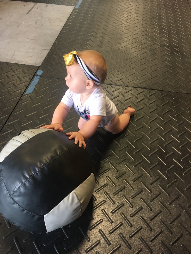 She crawled a few steps to grab a water bottle that wasn’t hers and to get to this medicine ball today.