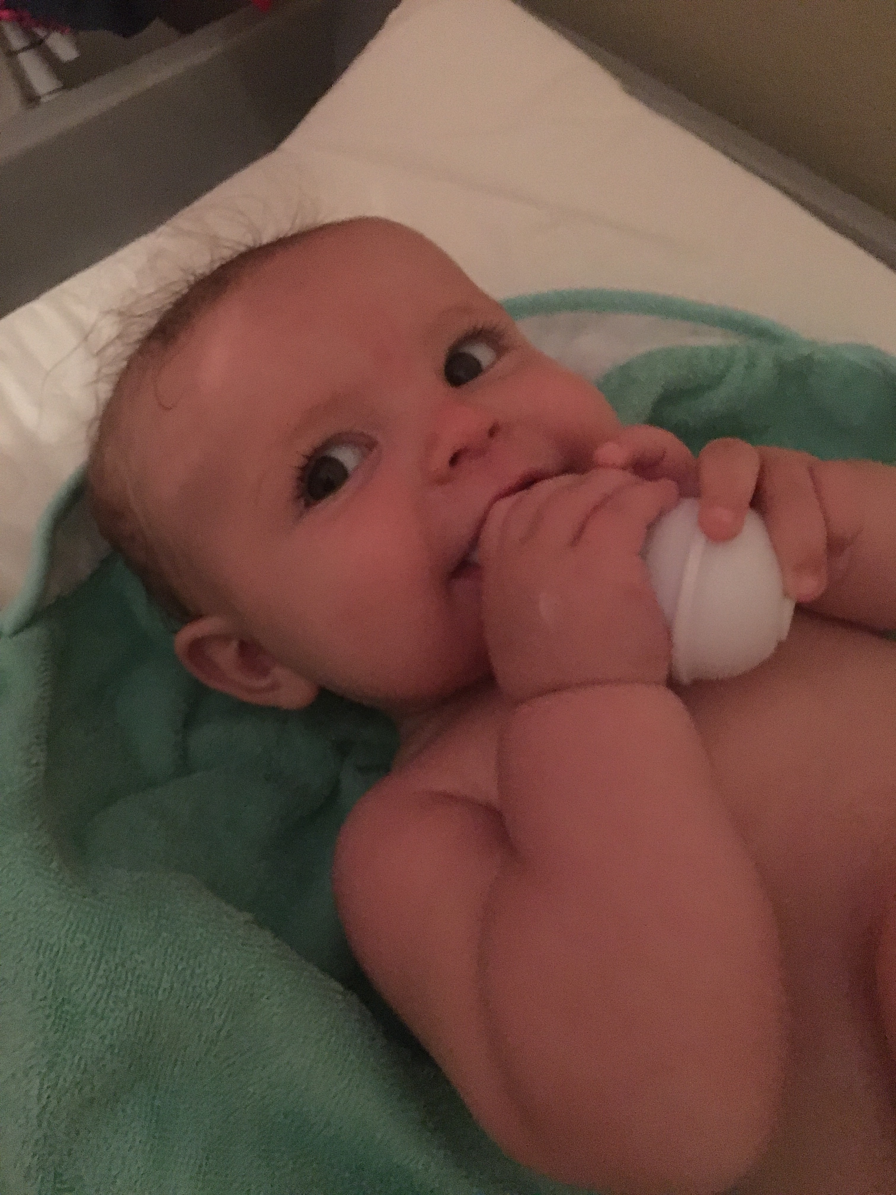 Today I put a (clean, never been used) bulb syringe on the side of her changing table where I knew she could reach it but she had to stretch for it a little bit (because if it seems like she shouldn’t have it it’s that much more appealing to her). Every time I went to change her diaper she’d grab it and lay on her back and play with (eat) it.