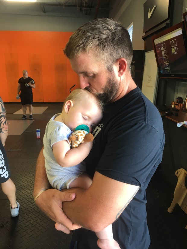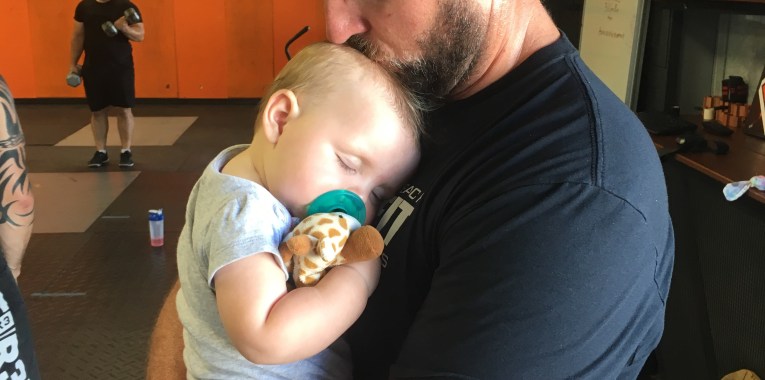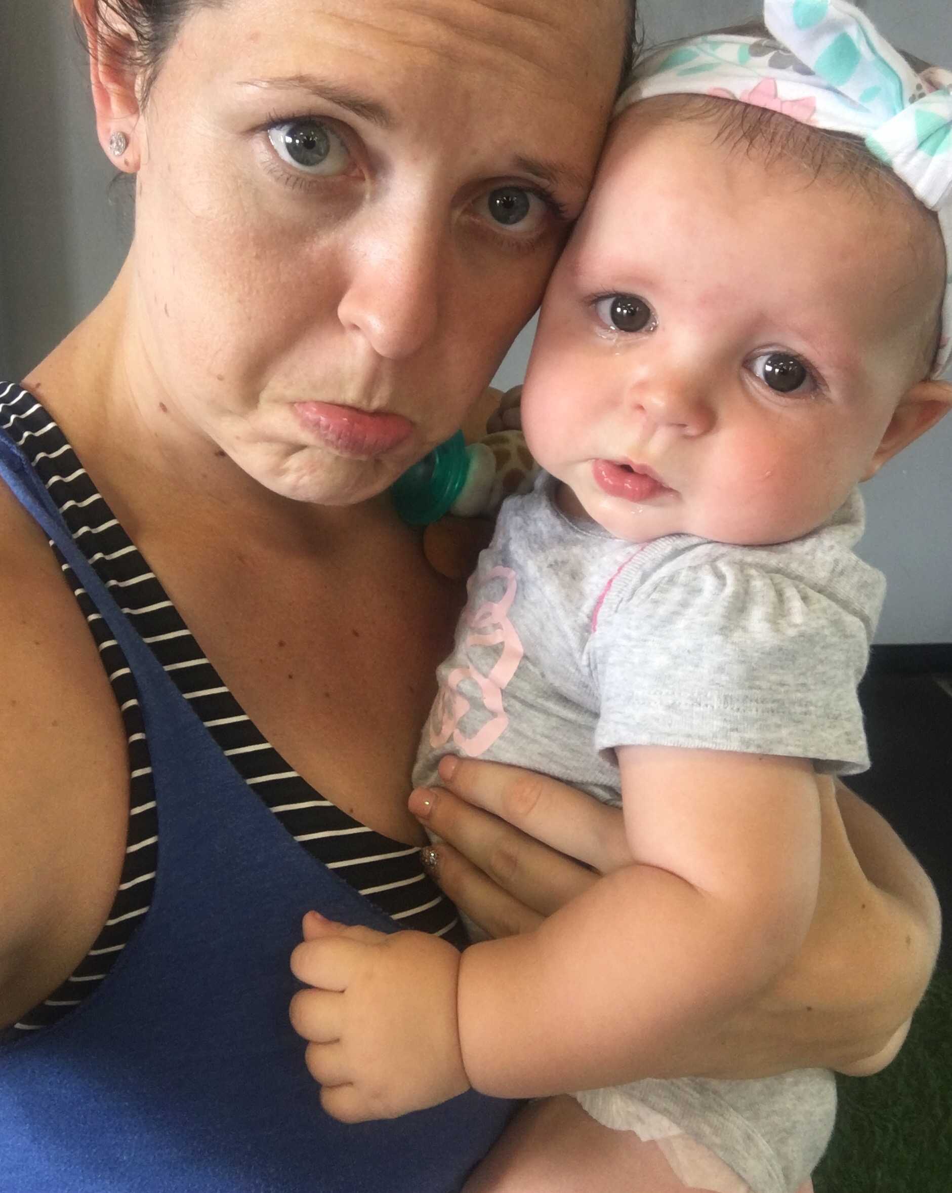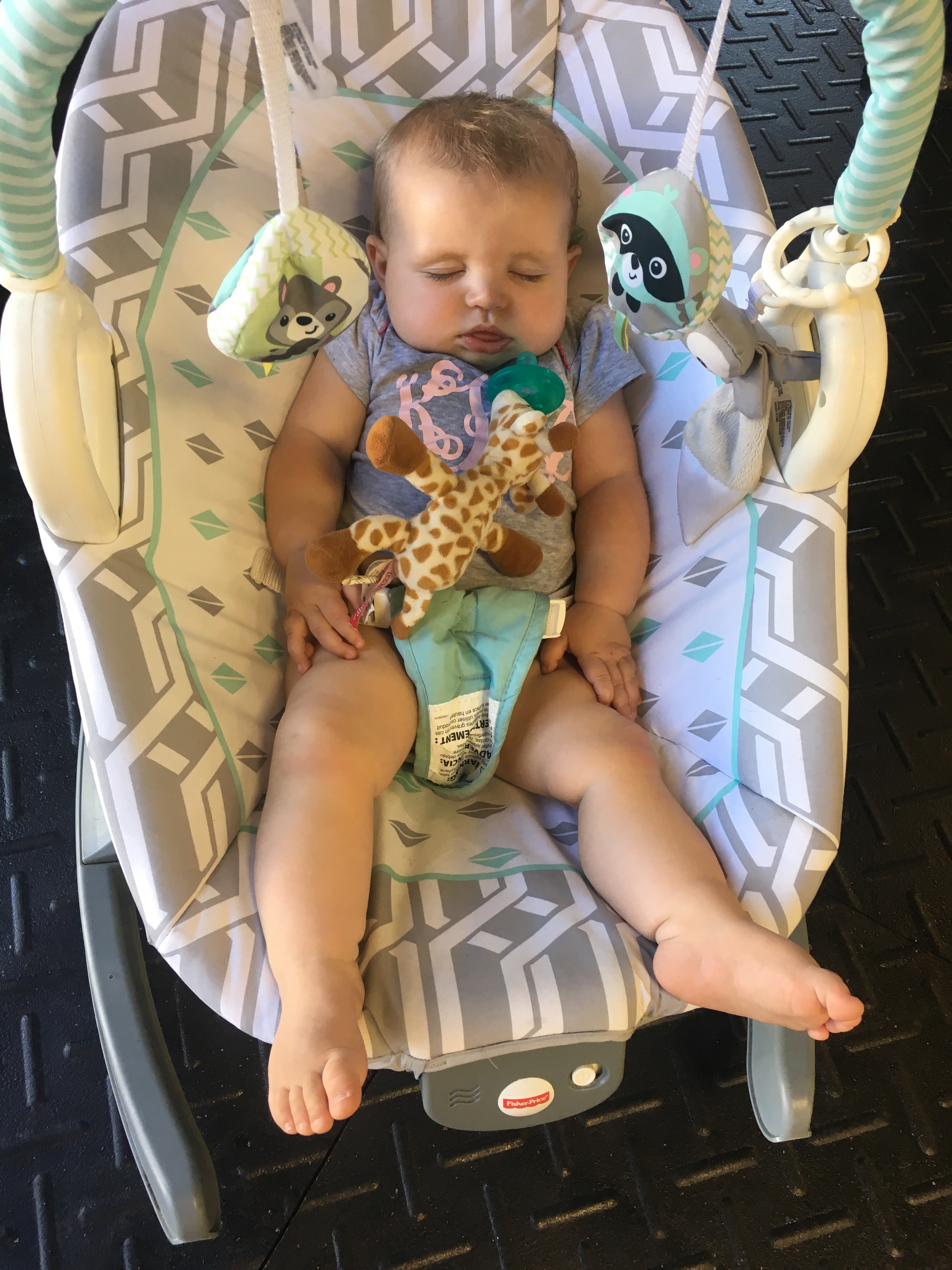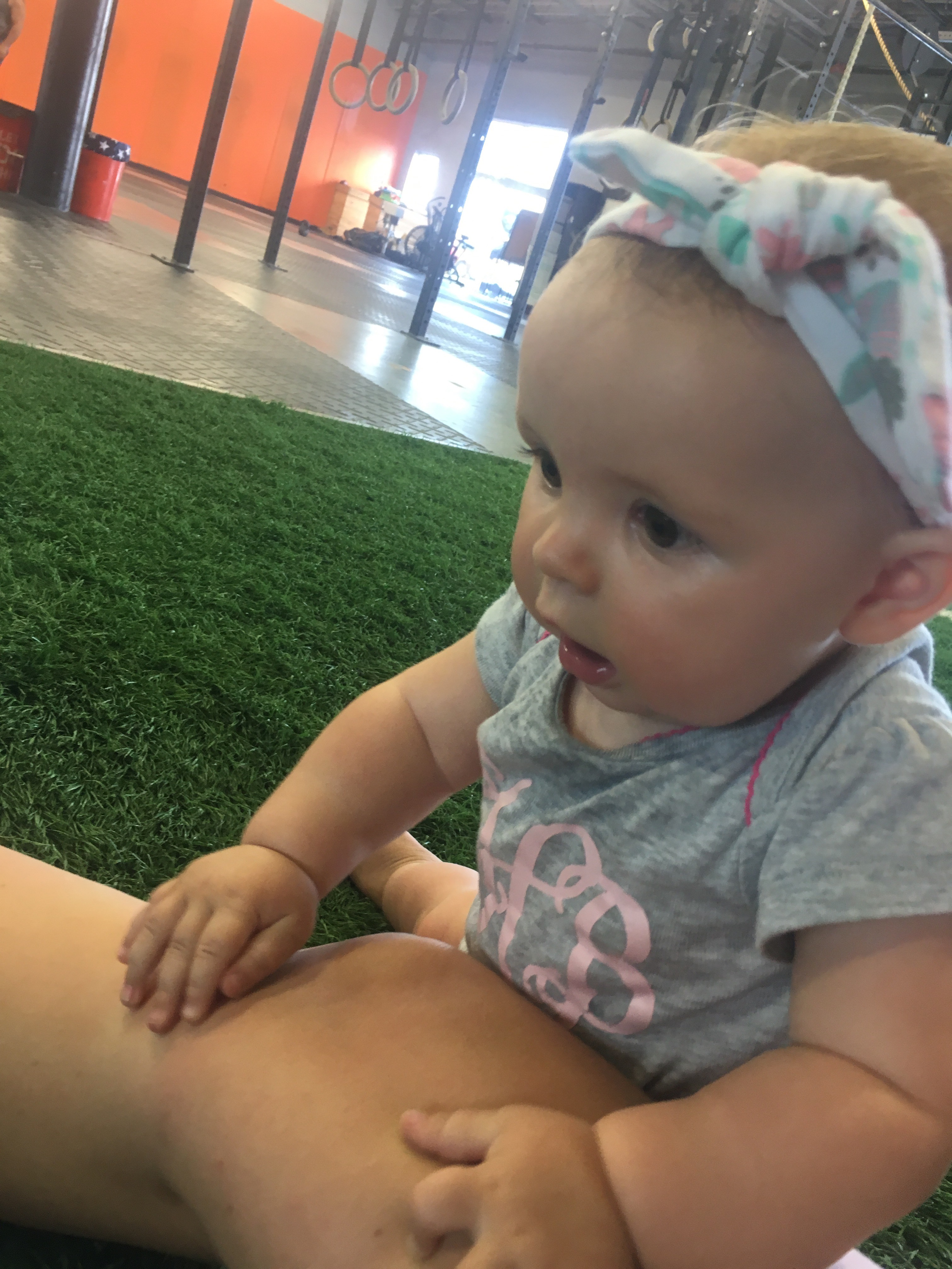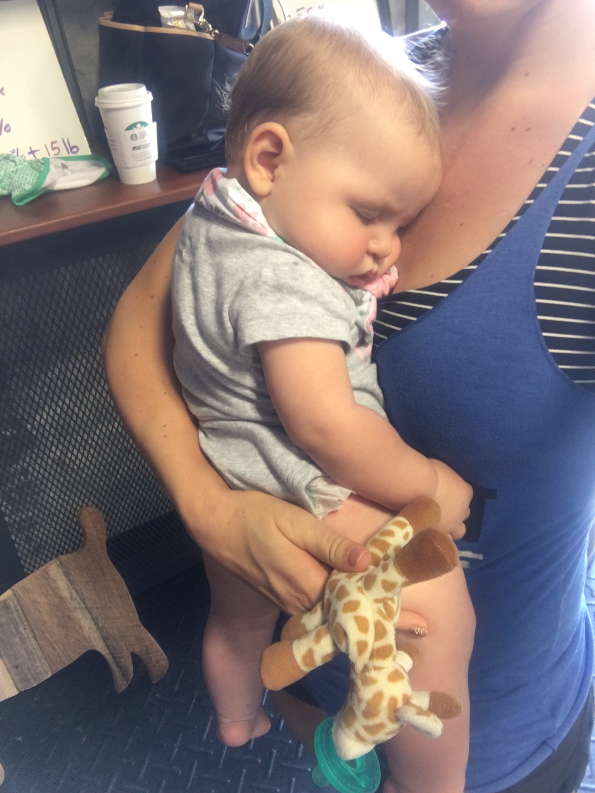K has woken up at 6am the last 2 days (yeah, NOT a fan) and this morning I had to coach. Kensie was exhausted so she turned into a stage 5 clinger. This was the way I coached both my morning and afternoon classes since those were the ONLY times K baby napped today.