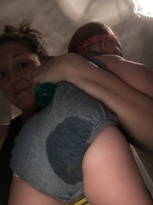The flash on the focused photo made her blink, but it’s a great display of how much snot was running out of this poor babe’s nose all morning.