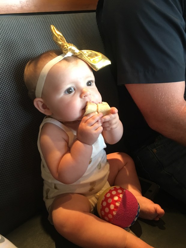 Kens had a special lunch date with daddy and some friends! She loves to “participate” now. (That means climb all over and try to grab things off the table). I gave her some bread and she was extremely pleased with her situation.