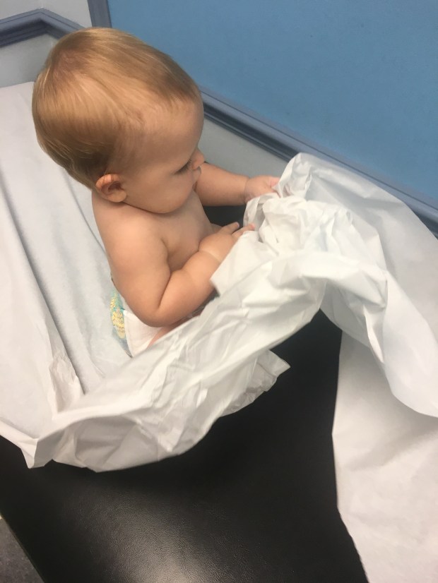 I would like to point out, however, that my “super accurate stand on the scale with and without her” method worked pretty dang well! I got 18.2 and the doctor’s scale weighed her in at 18.1lb today! Her weight puts her in the 45th percentile and her length of 26.5 inches puts her in the 9th for height. 😳 I feel like her leg had to have been bent when the nurse measured her…lol