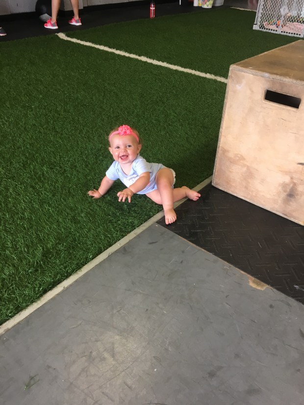 This evening it was back to the gym to coach and workout and I was shocked at how long KB played by herself in her baby jail!!! She used to get really frustrated when she stood up and no one came to get her. Now that she knows how to sit back down she seems to tolerate it a lot longer!