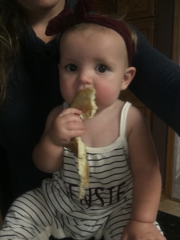 I also found something Kensie seems to like as much as zuchinni…turkey!!! I shared some off my sandwich with her at lunch and she kept wanting more. We also have her a pancake. She enjoyed shaking it and tearing it apart…