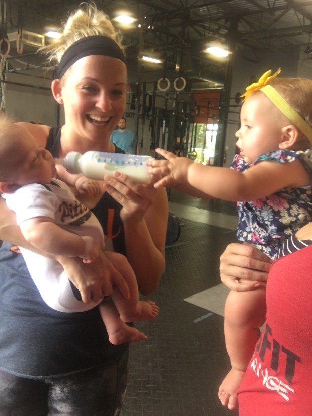We rushed home for a bath and back up to the gym for the Barbell Club Meet! Kensie clapped for all of them and while she made many attempts at getting down to crawl around she sucked it up and let me hold her.