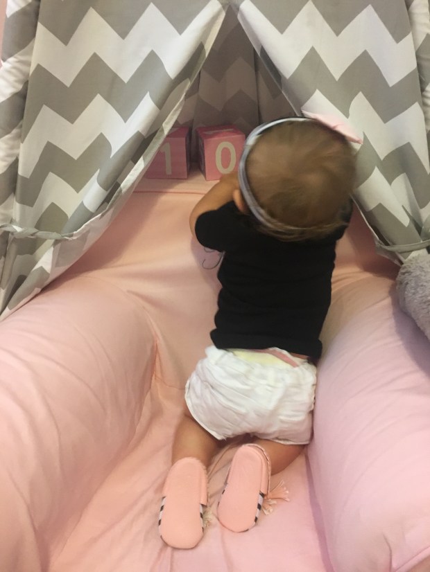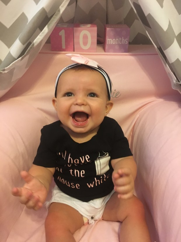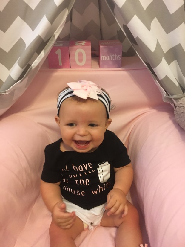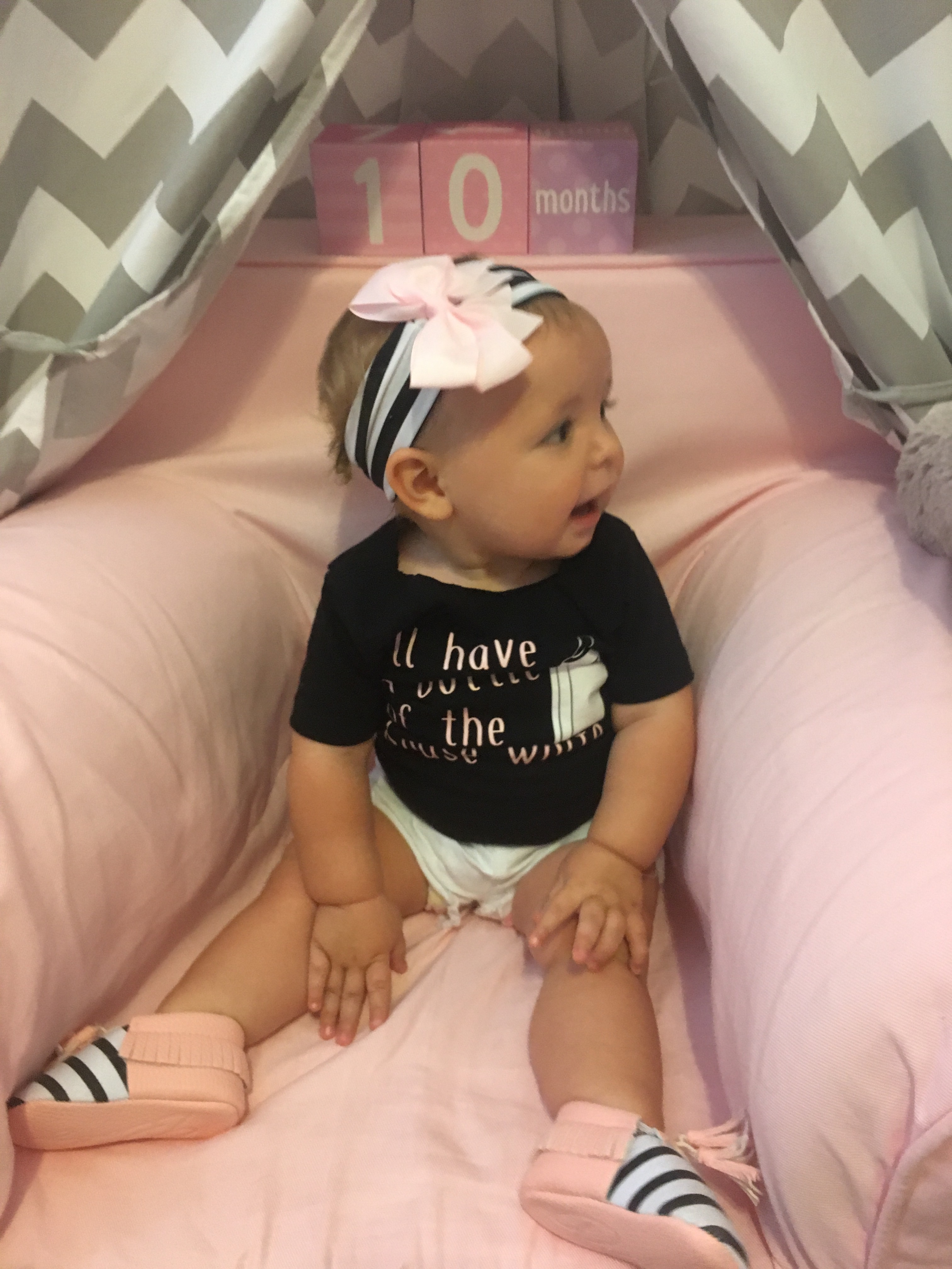 We’re going a little out of order and posting her 10 month update and then her weekend recap because it’s way too much to fit into one! I know I probably say this every month but where does the time go and please slow down!! Ahhh I love this little 10 month old booger. This has been such fun month of new things!!