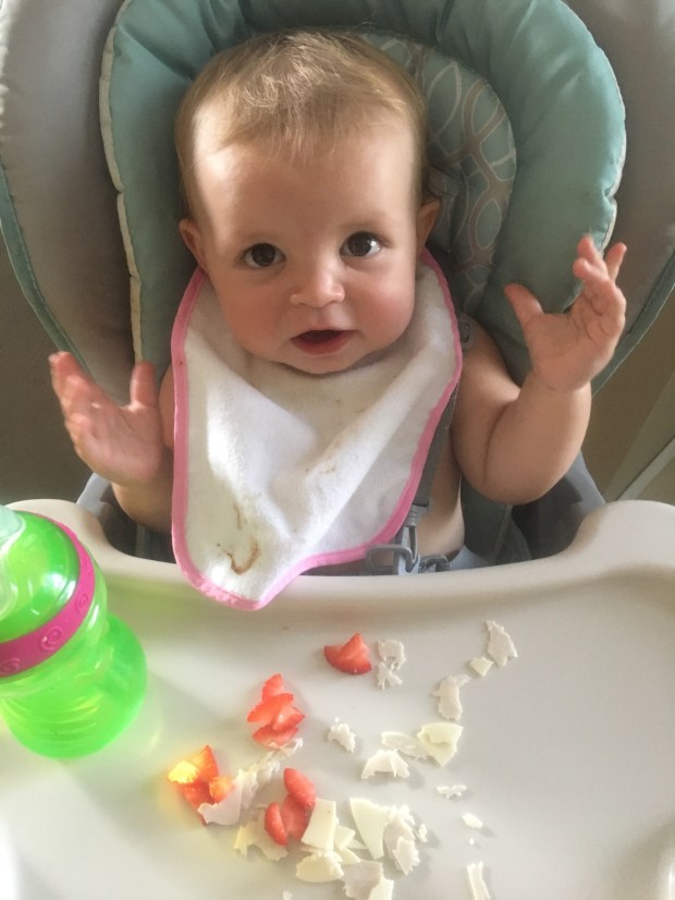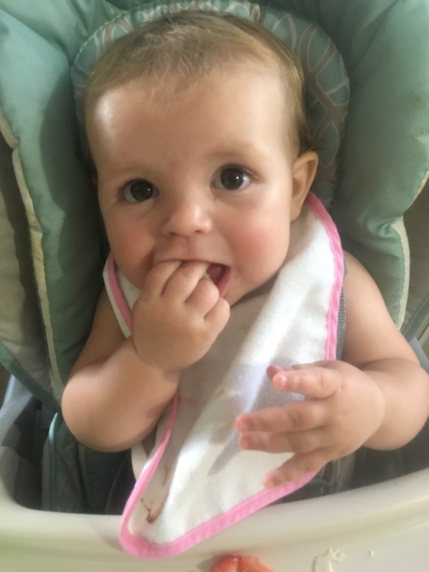 I’m trying to get her in a habit so we did breakfast lunch and dinner today in her high chair and gave it a go. I’m hoping once she recognizes the routine she’ll start eating more before she decides to rip off her bib, shake her head side to side and throw all her food on the floor. She wasn’t interested in the egg yolk but she ate all of her oatmeal at breakfast!