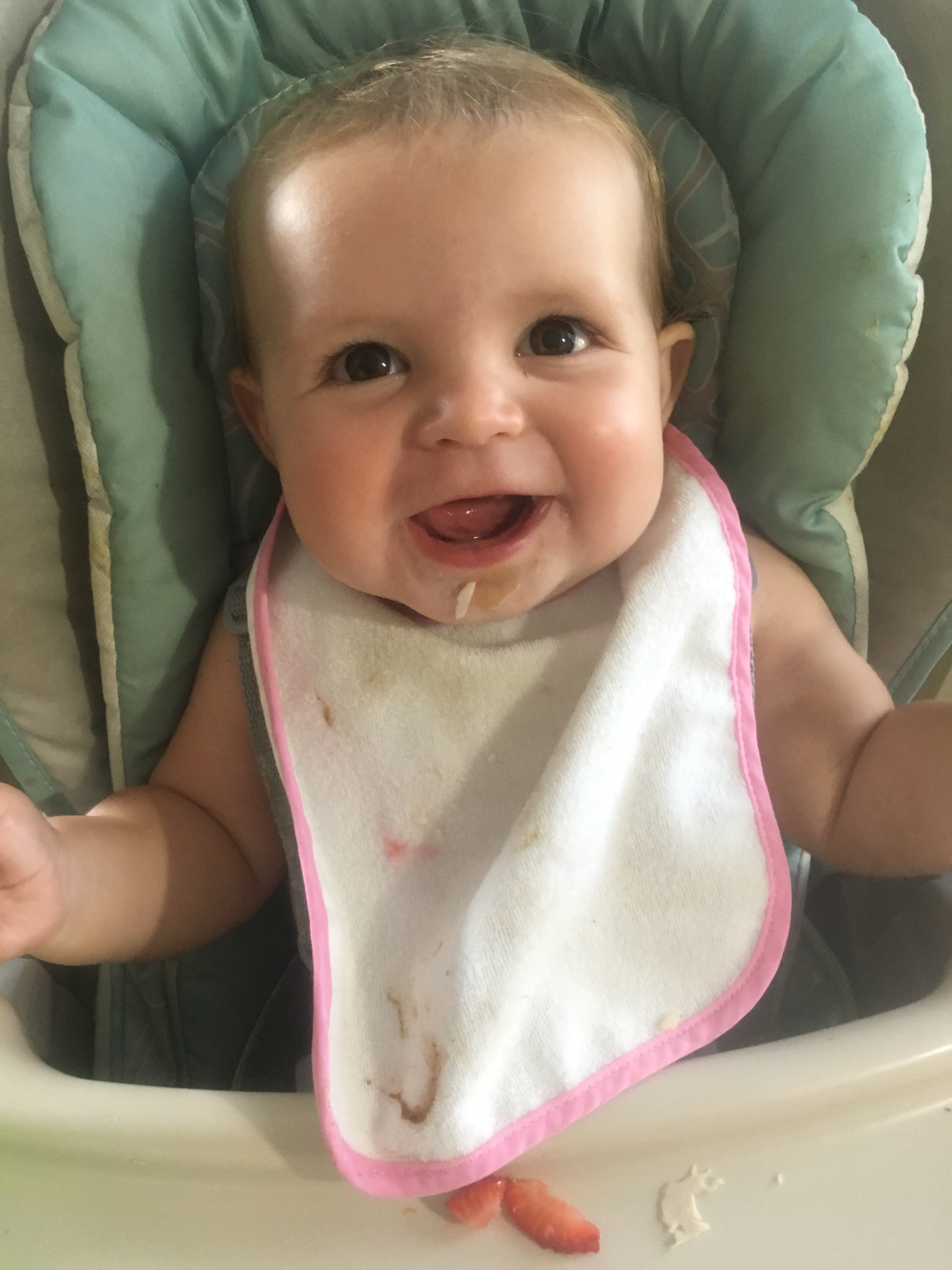 I’m trying to get her in a habit so we did breakfast lunch and dinner today in her high chair and gave it a go. I’m hoping once she recognizes the routine she’ll start eating more before she decides to rip off her bib, shake her head side to side and throw all her food on the floor. She wasn’t interested in the egg yolk but she ate all of her oatmeal at breakfast!