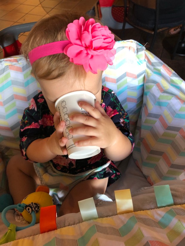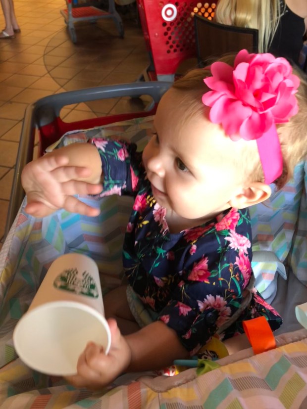 She was a waving fool today! EVERYONE got a wave and a smile.The barista gave Kensie her own cup and she fake drank out of it. 🤦🏼♀️😂