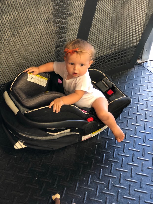 She’s been crawling into her car seat lately when she’s tired and I find it hilarious. K took it one step further today and decided to turn it into a balance board so that game had to end. (At least until she gets a helmet). 😜