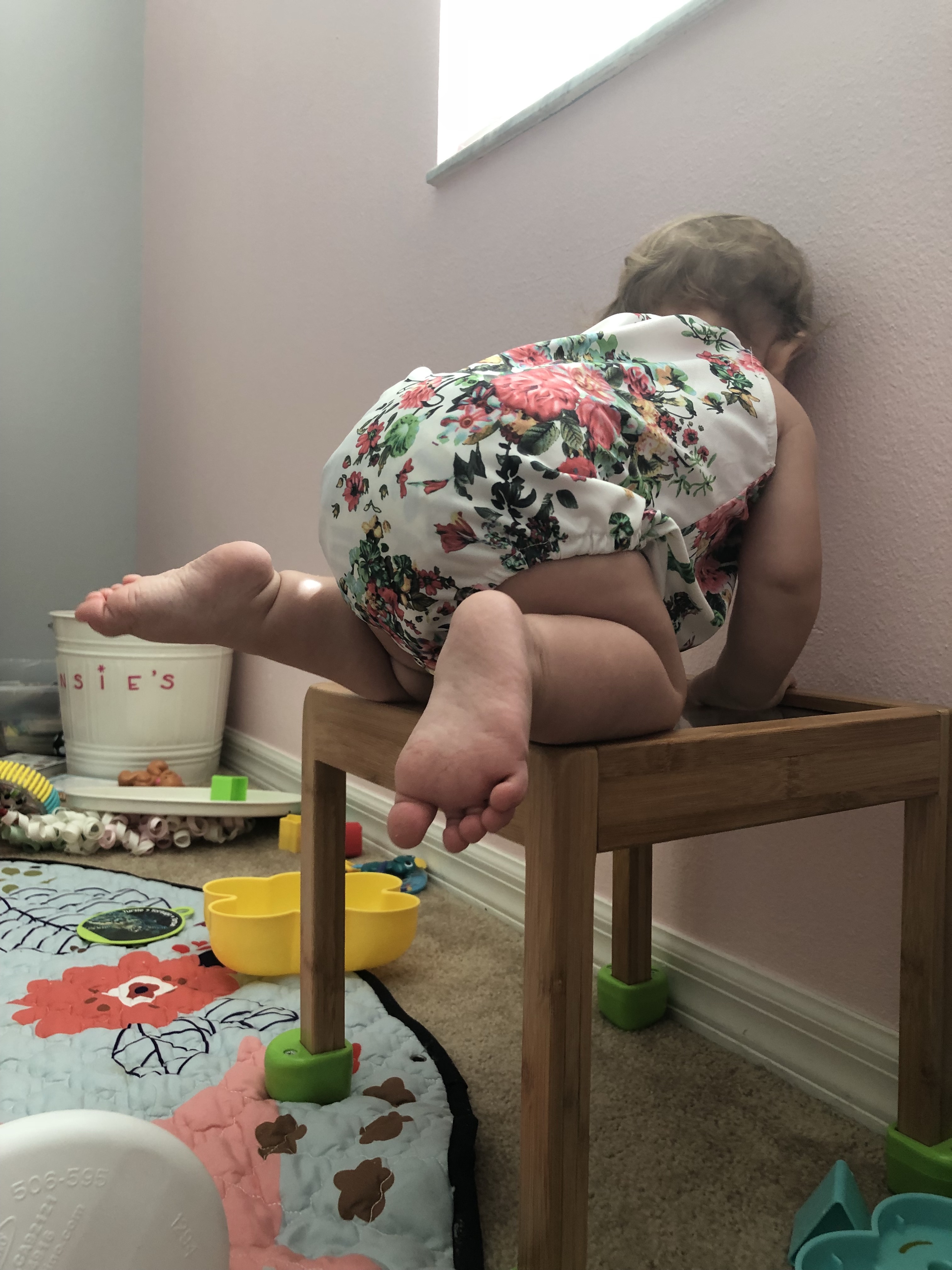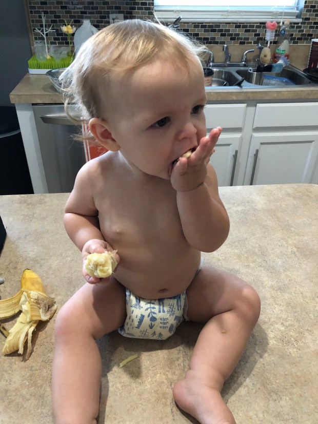 This morning K partied in her diaper and ate breakfast on the counter. I was trying to eat some breakfast quick and she kept trying to climb up my leg. I set her up by me and handed her a banana to see if she’d eat it. She was too high to hand it to the dogs so it was a lot more successful than anything she eats in her high chair.