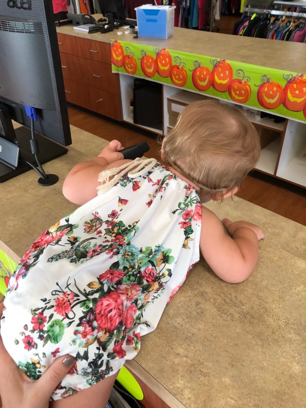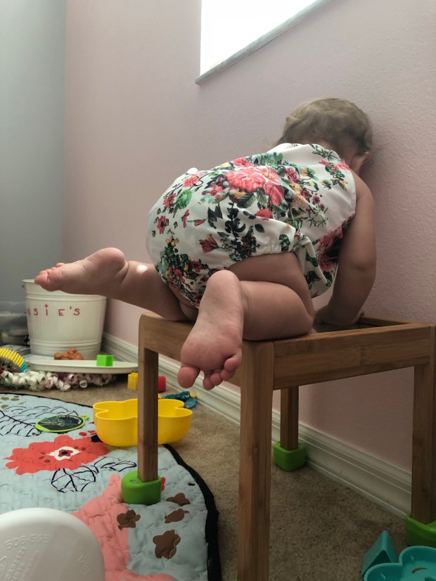Anyways, Kensie kept grabbing for them so I licked the salt off a corner and gave her a piece. Y’all. MIS. TAKE. She was grunting and pointing and ooing and straight BEGGING for them. I gave her a few more. We went and got her PJs on. I sat down to feed her. She rolled off my lap, crawled away, found the chips and started pointing and grunting again. 😂