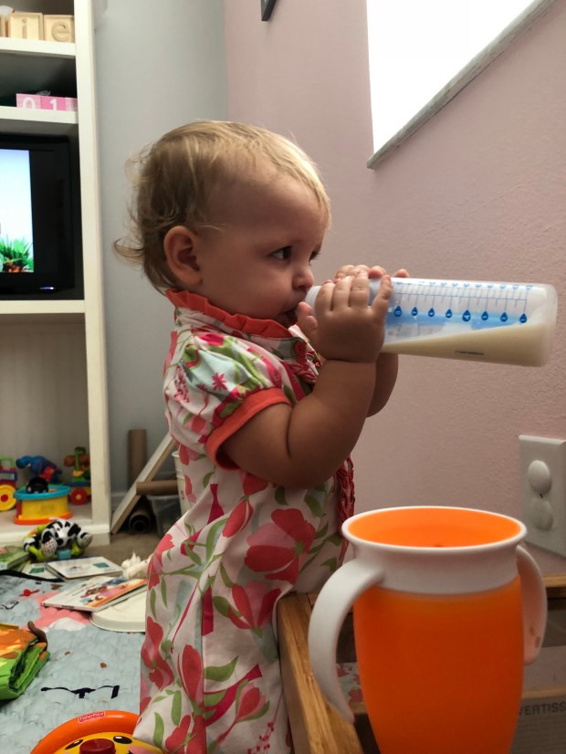 Once I moved it into the bottle Kensie would take a sip here and there and toss the bottle. Haha! 🤷🏼♀️ A friend recommended mixing it with breastmilk to transition her little by little. To be honest I didn’t want to have to pump every time in order to do that so I figured I’d give the cold turkey thing a shot. K is apparently not going to let that happen.