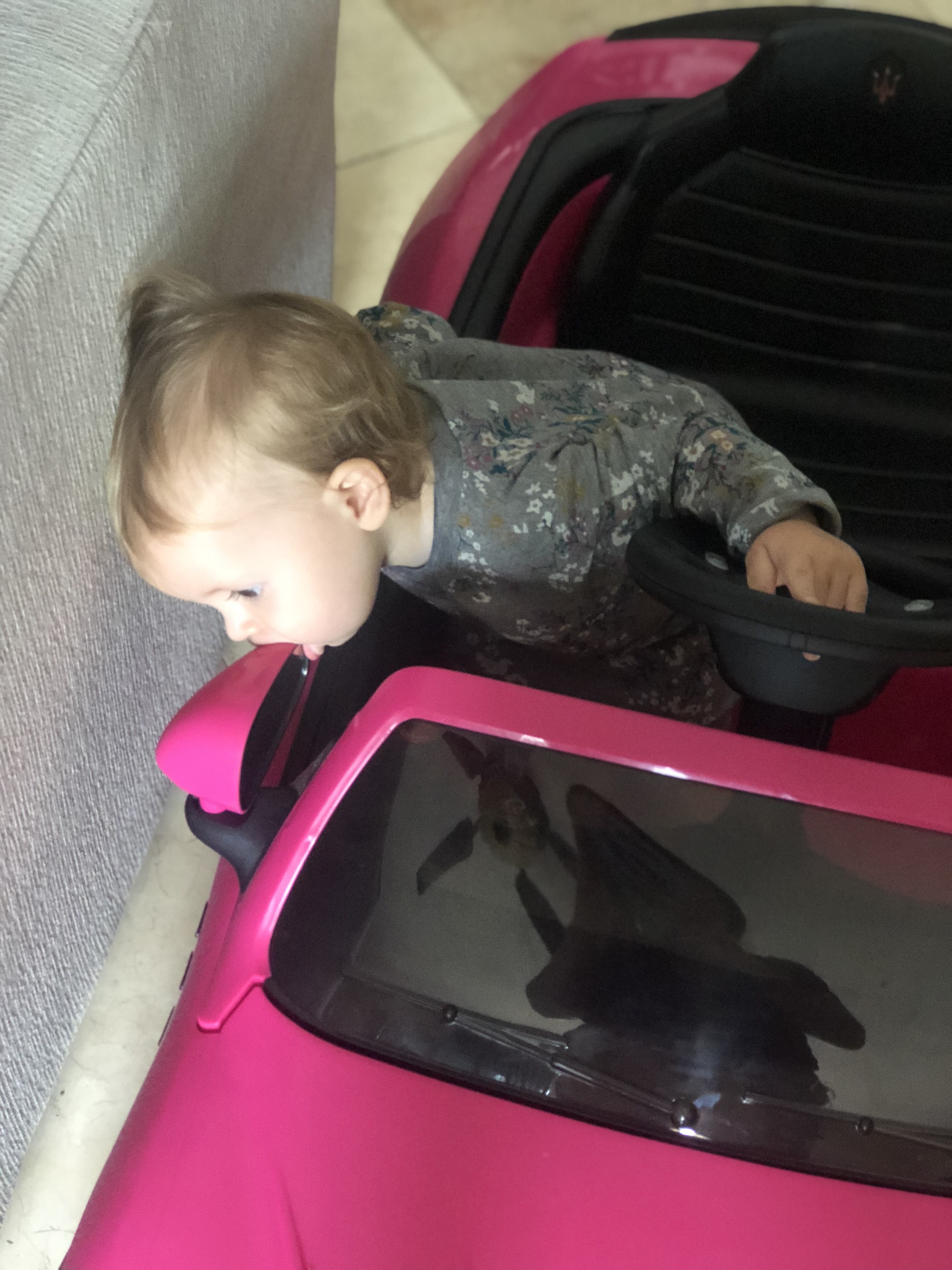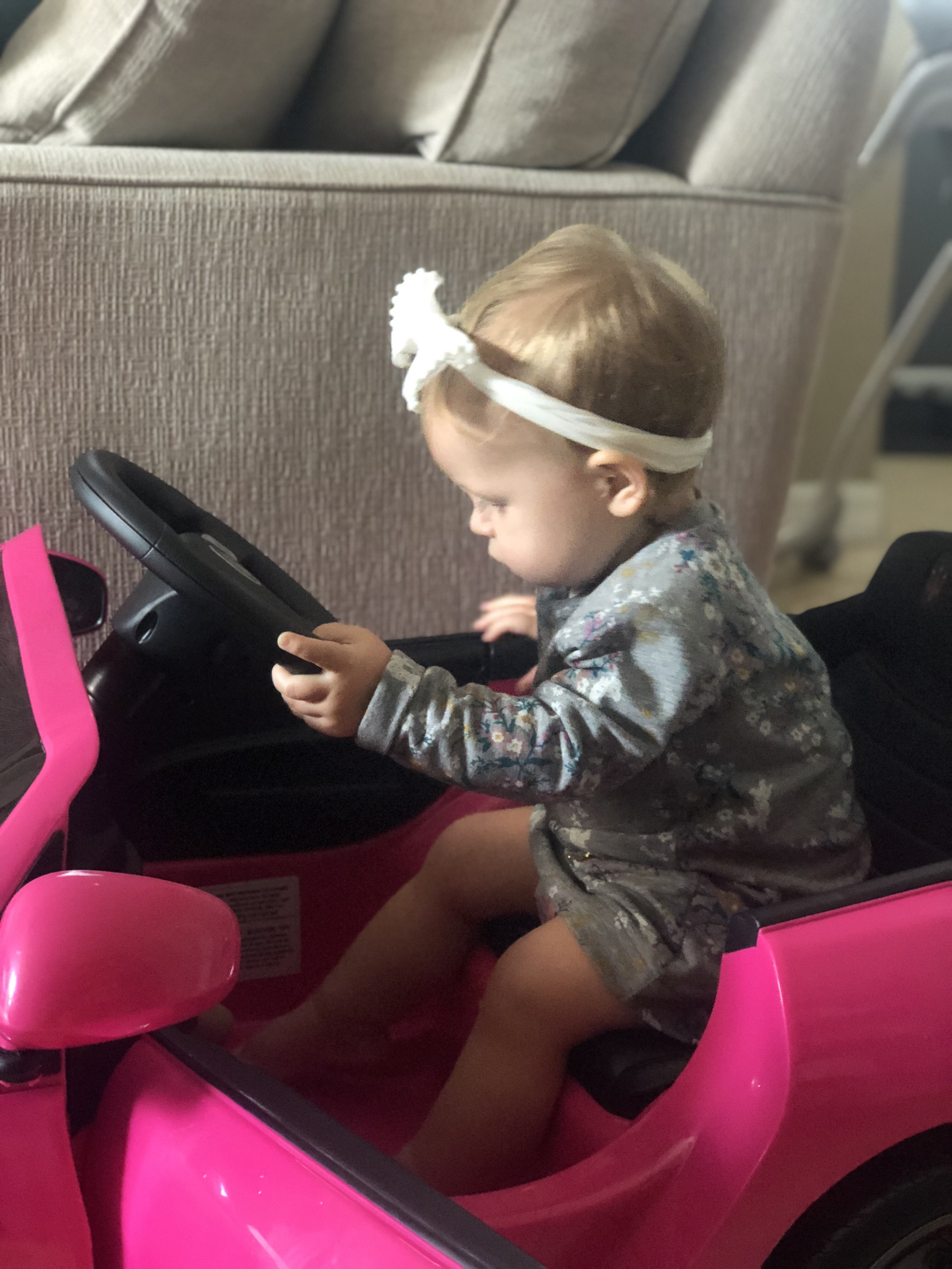 Her favorite toys are…anything that isn’t actually a toy. Remotes. Coasters. The computer mouse. Cell phones. Bags. Oh my gosh she has this weird love for bags. She does climb in and out of her car on a daily basis. She likes to sit in it, swing her feet and drink her milk.